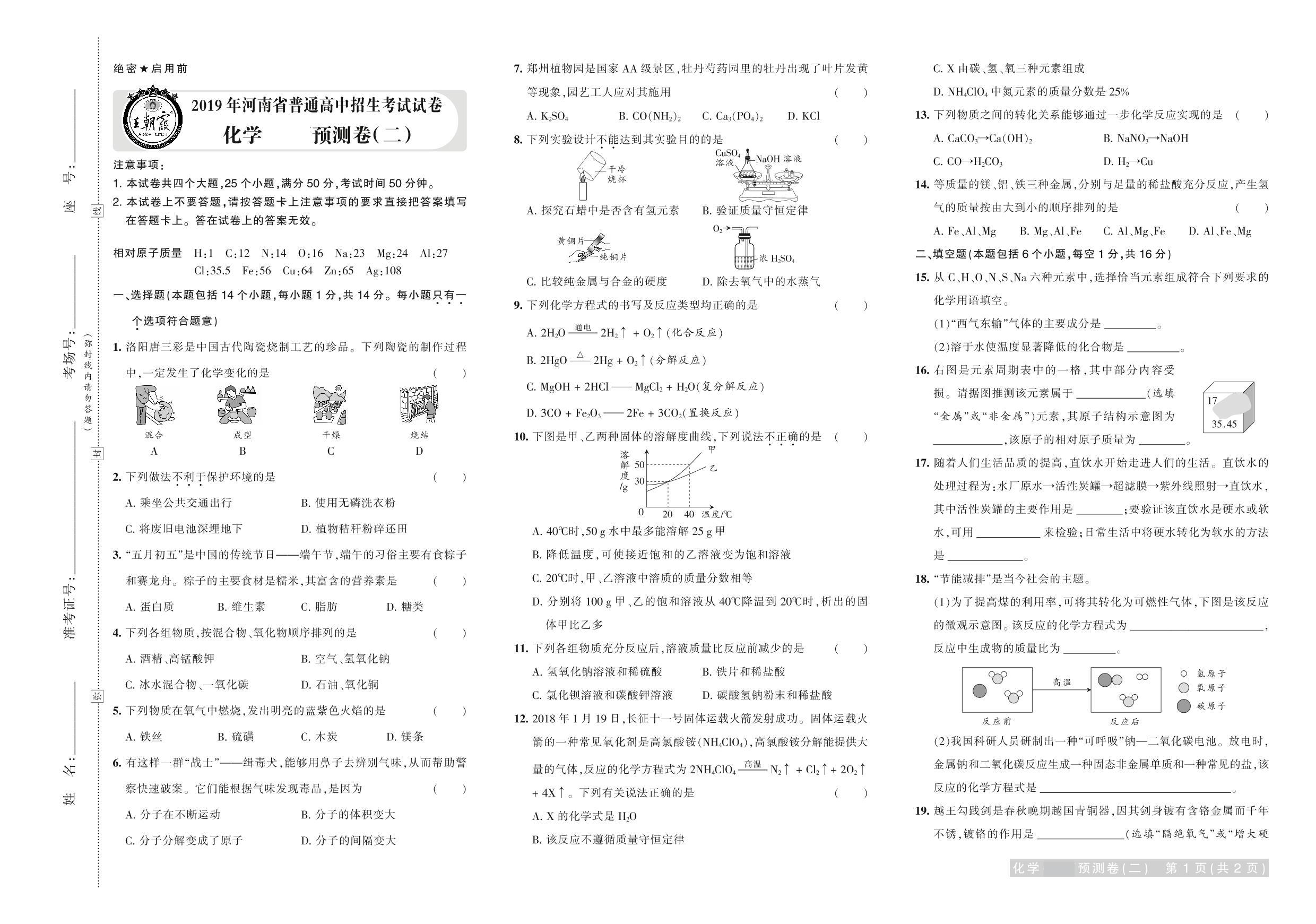 2019年河南省普通高中招生考试试卷化学·预测卷(二)