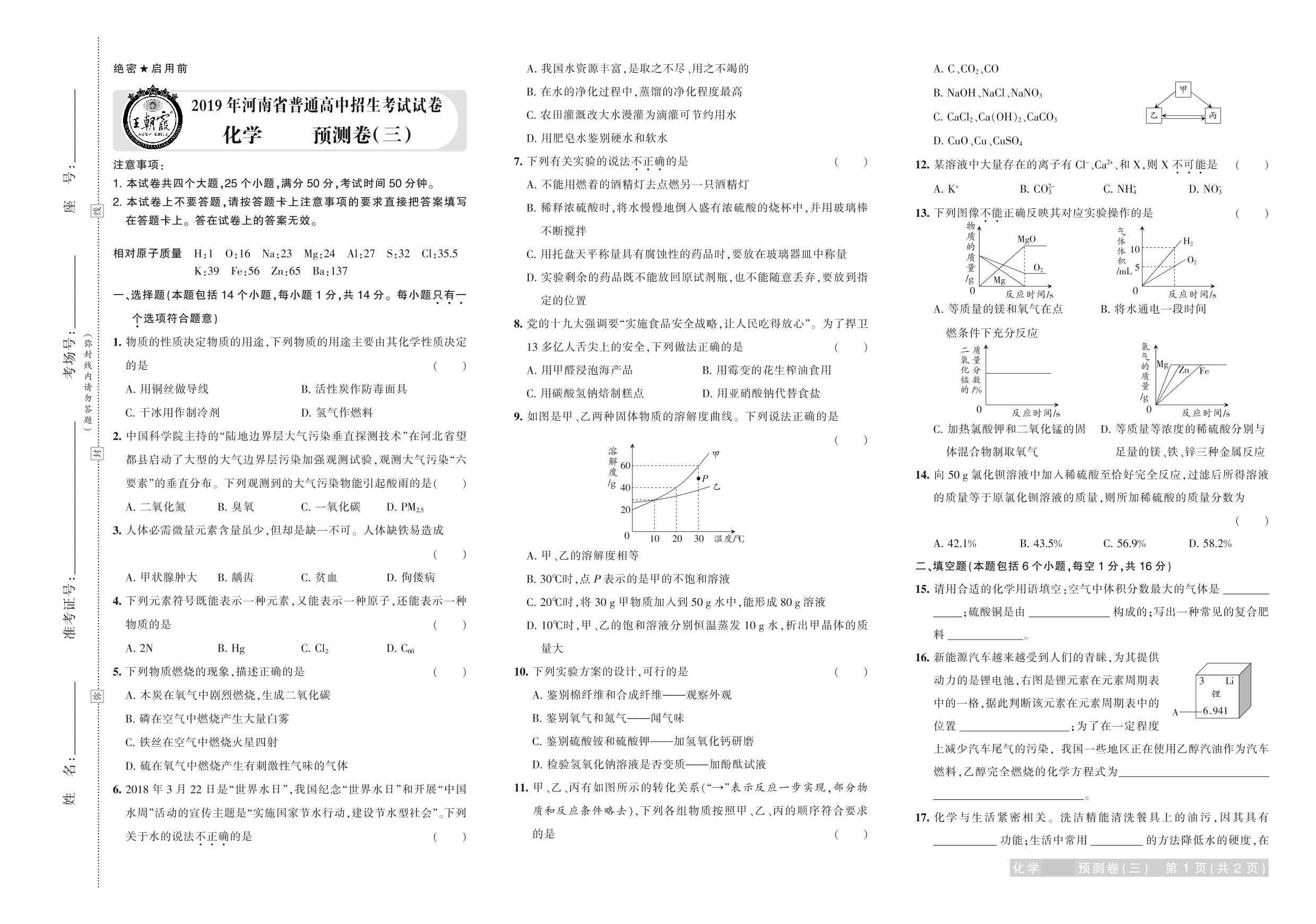 2019年河南省普通高中招生考试试卷化学·预测卷(三)