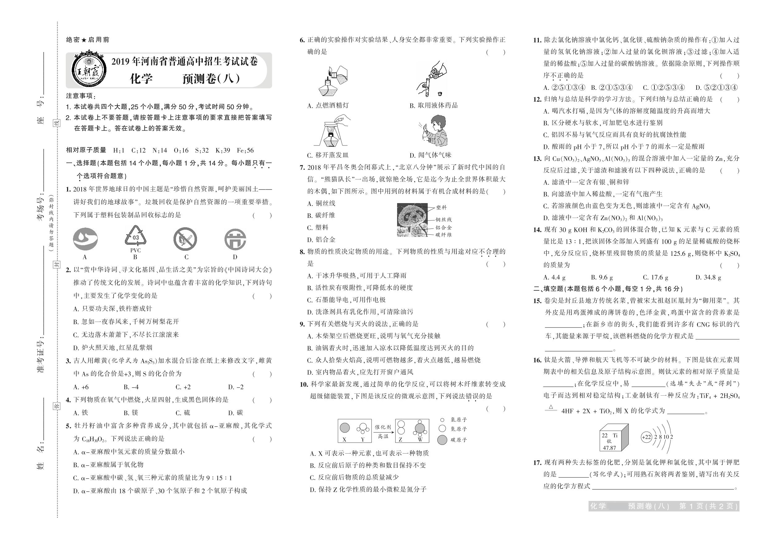 2019年河南省普通高中招生考试试卷化学·预测卷(八)