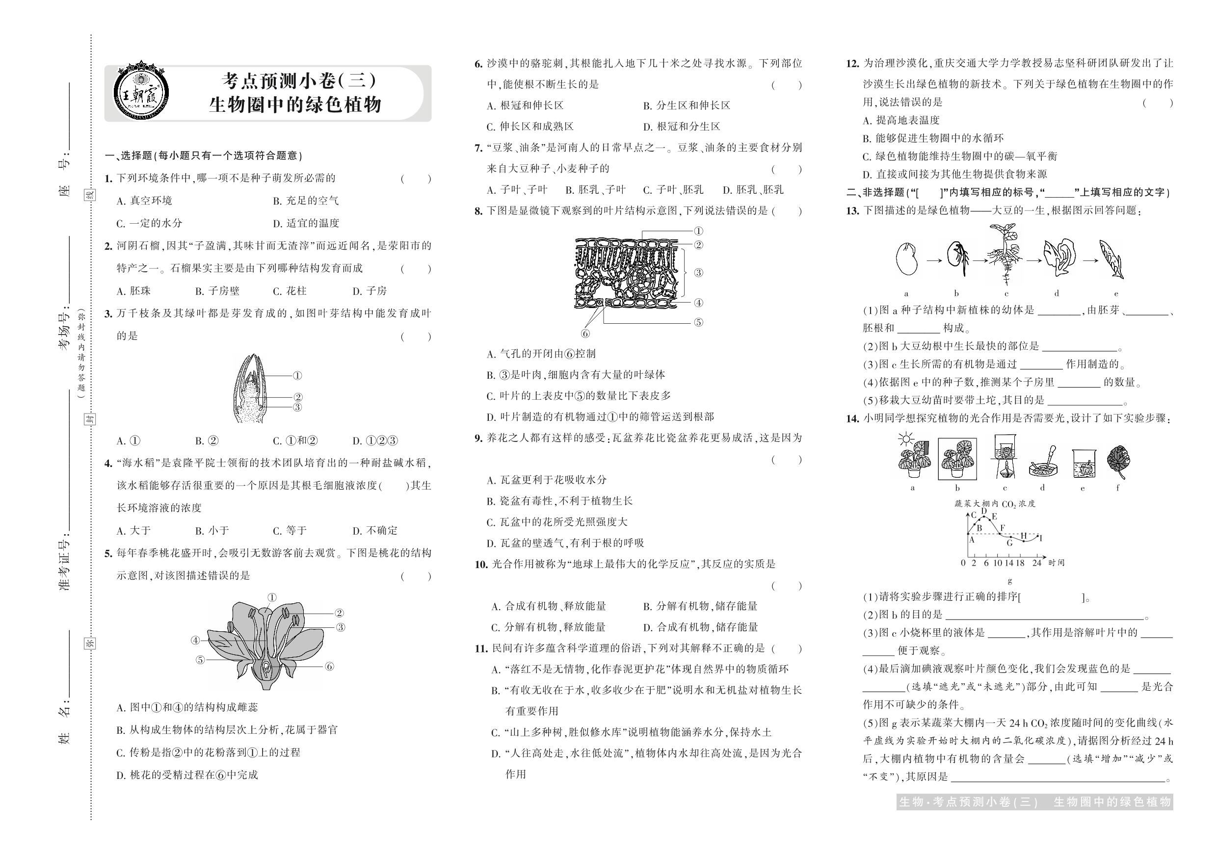 2019年河南中考生物考点预测小卷(三)生物圈中的绿色植物