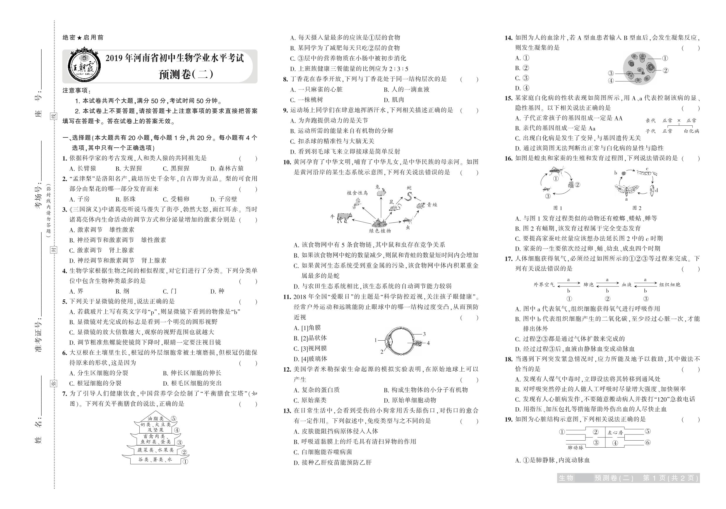 2019年河南省普通高中招生考试试卷生物学·预测卷(二)