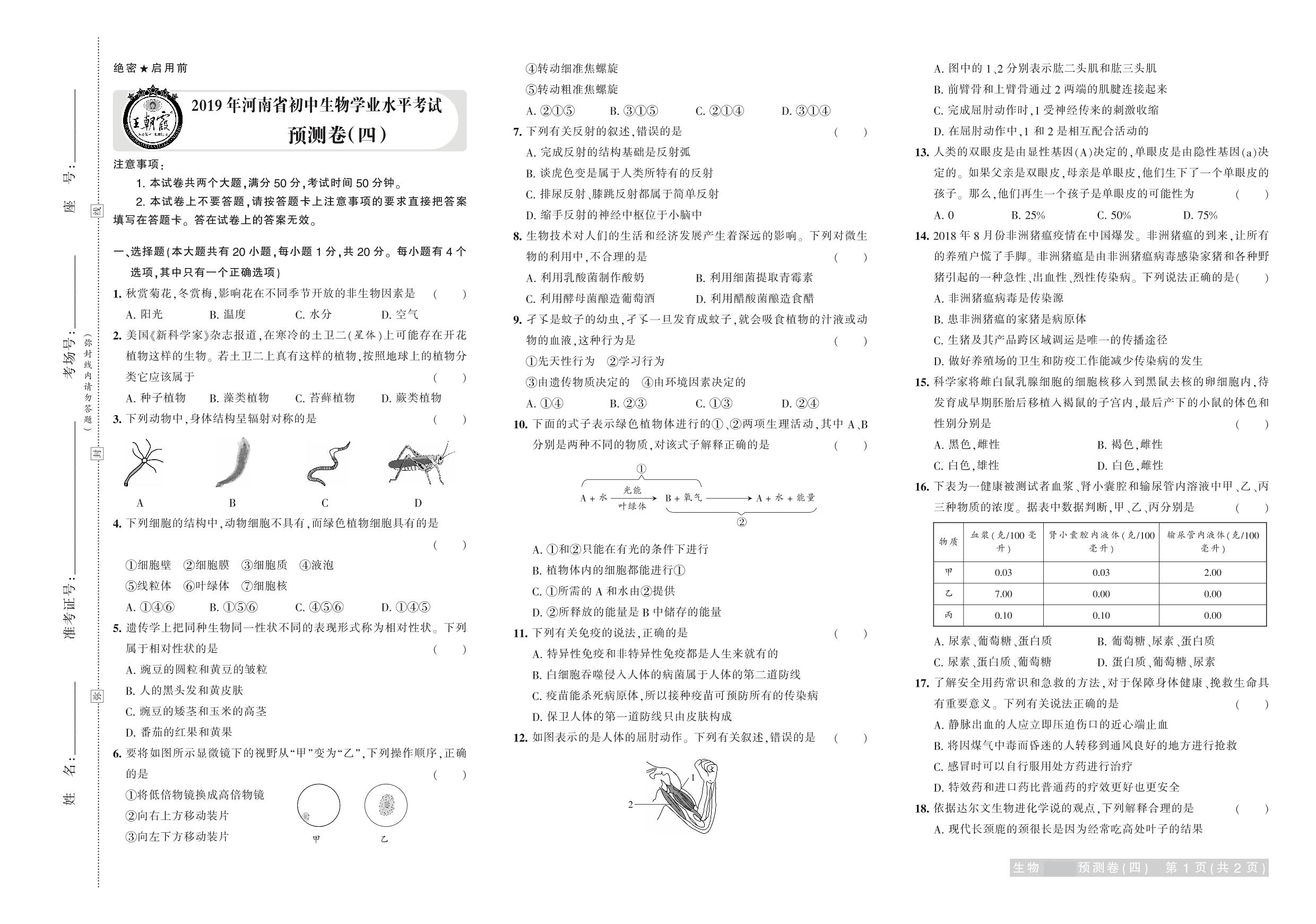 2019年河南省普通高中招生考试试卷生物学·预测卷(四)