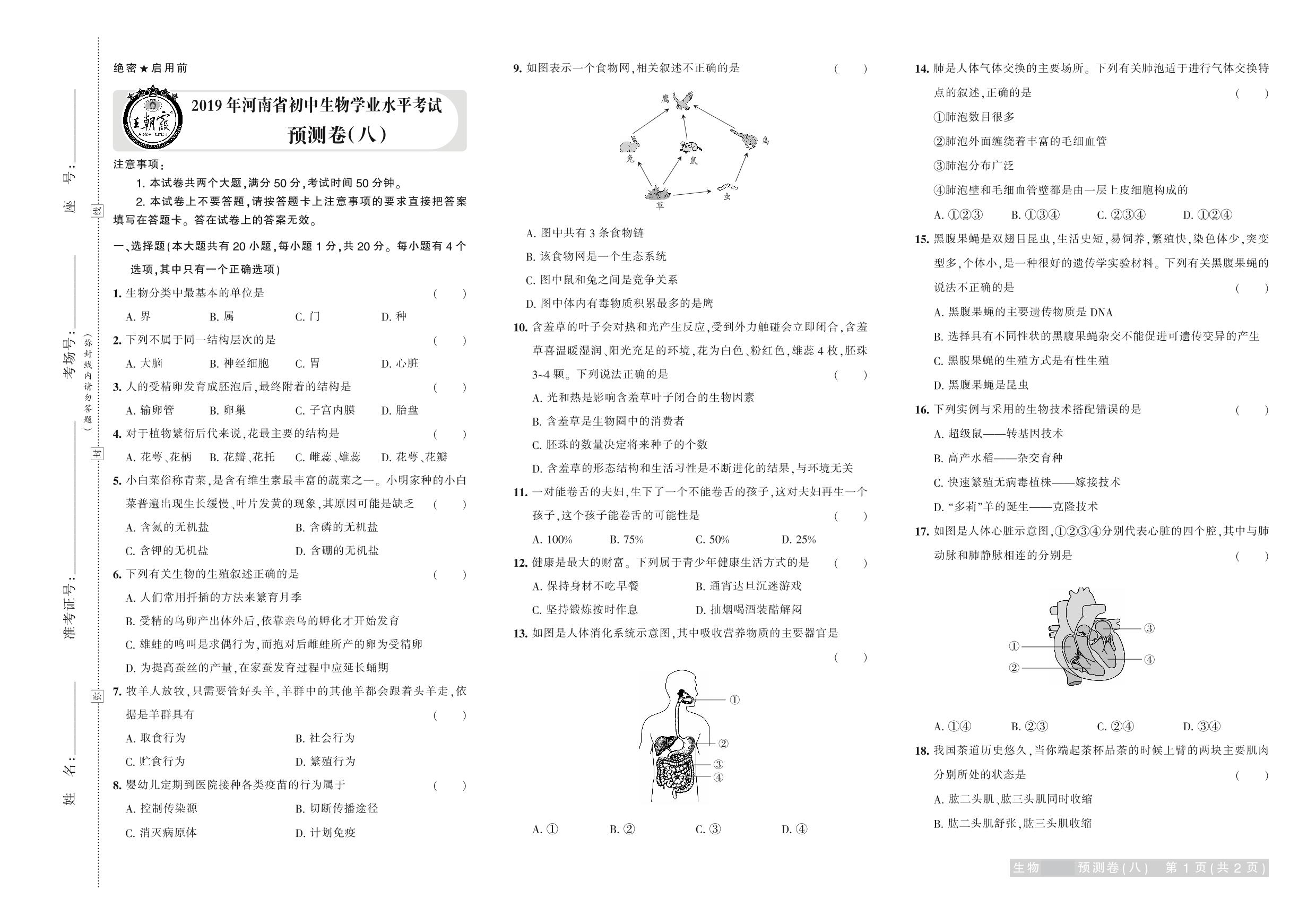 2019年河南省普通高中招生考试试卷生物学·预测卷(七)_R220112144240290