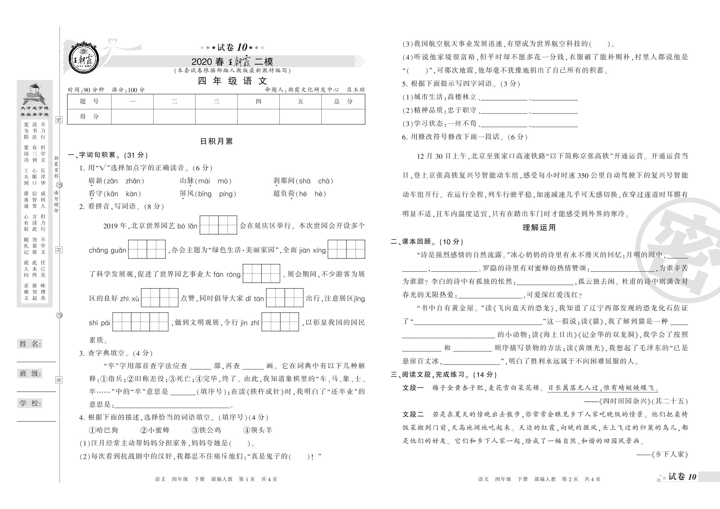 王朝霞期末模拟卷四年级下册语文(人教版)_R210801193832【10】