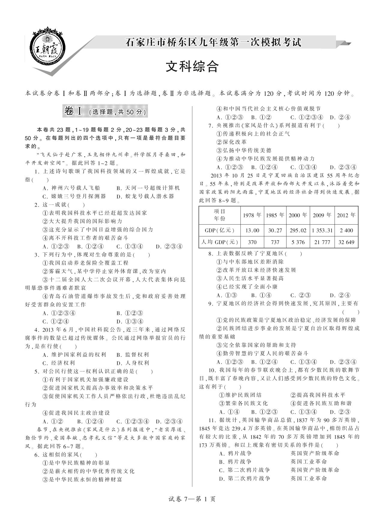 石家庄市桥东区九年级第一次模拟考试【7】