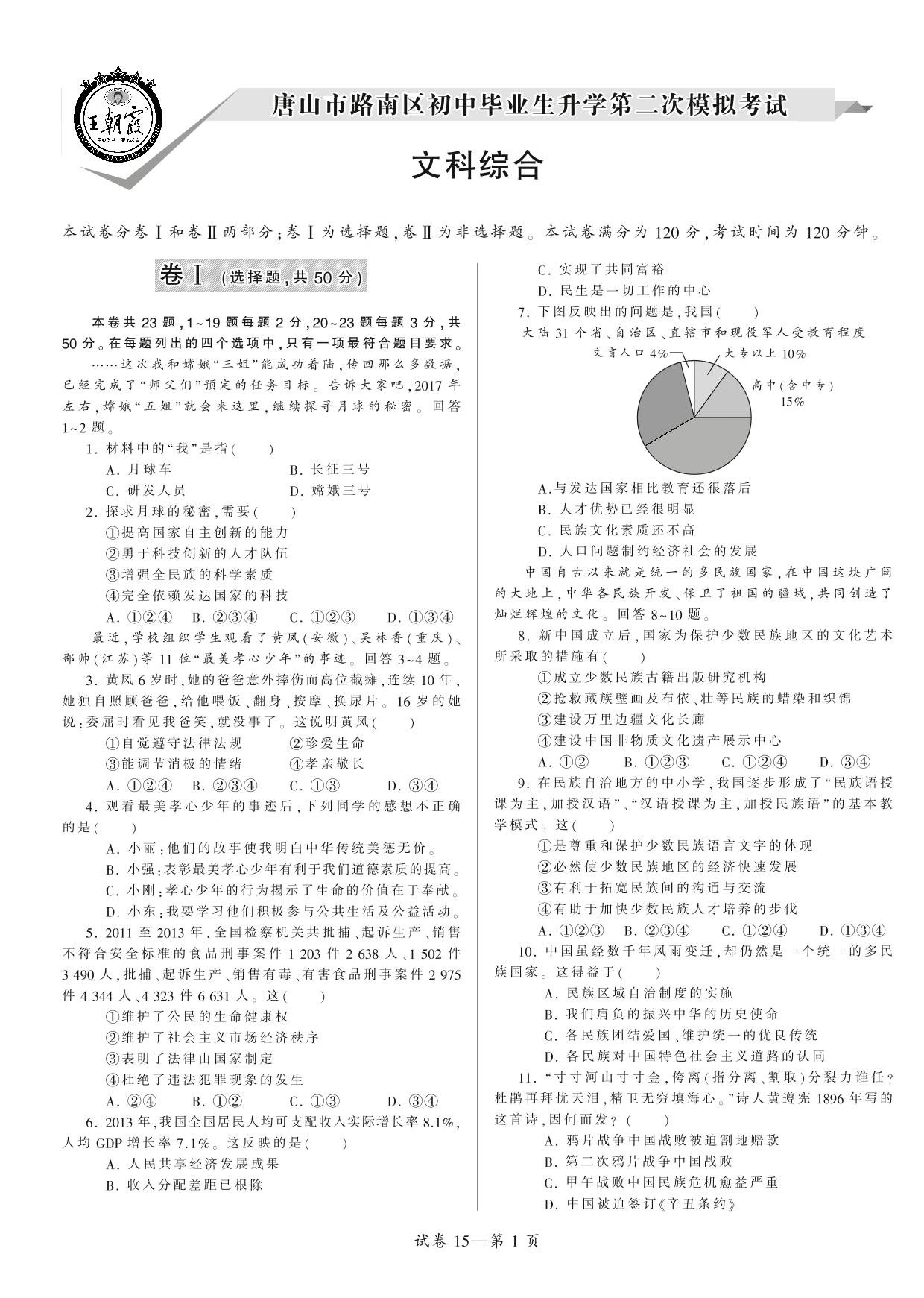 唐山市路南区初中毕业生升学第二次模拟考试【15】