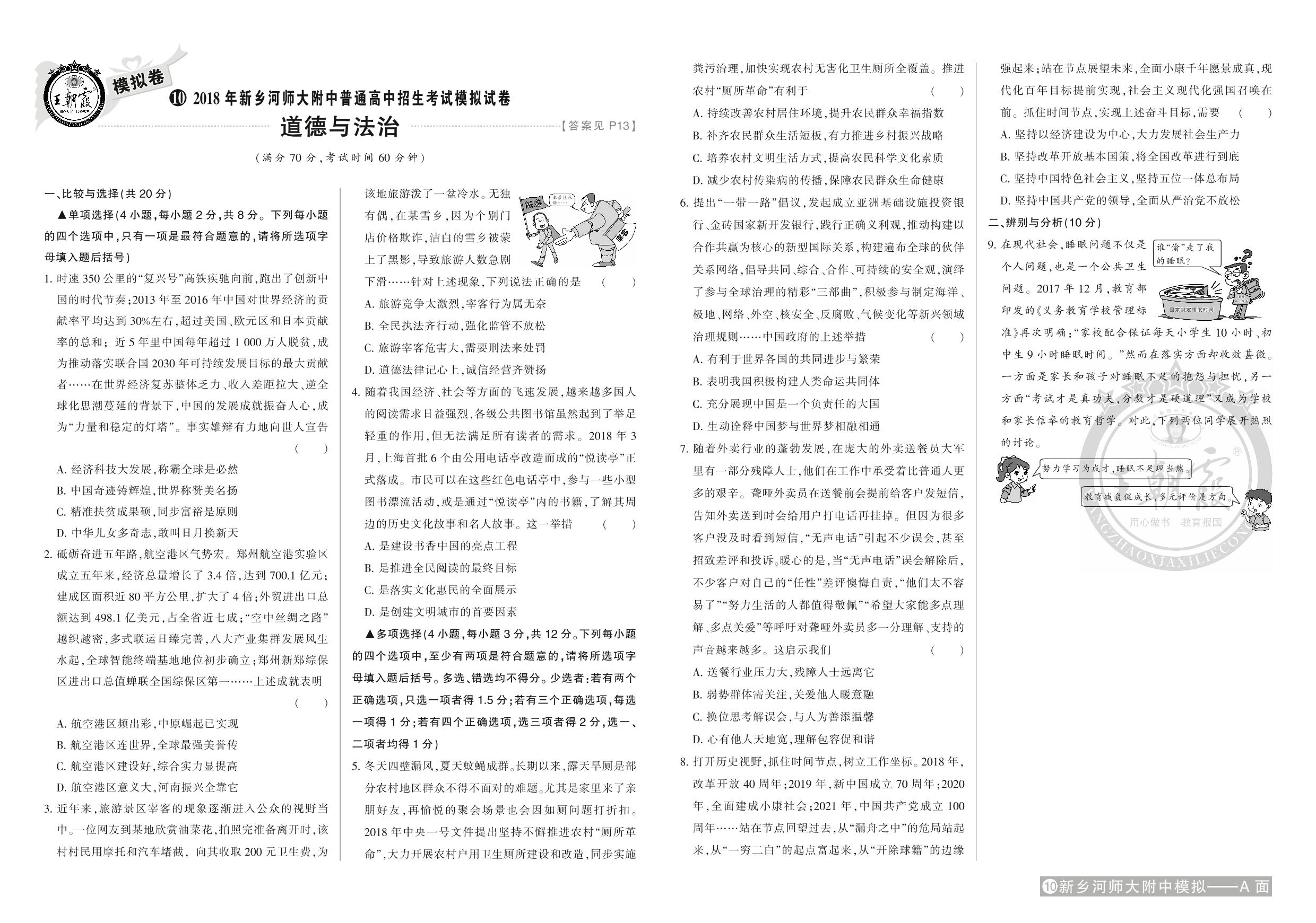 2018年新乡河师大附中普通高中招生考试模拟试卷【10】