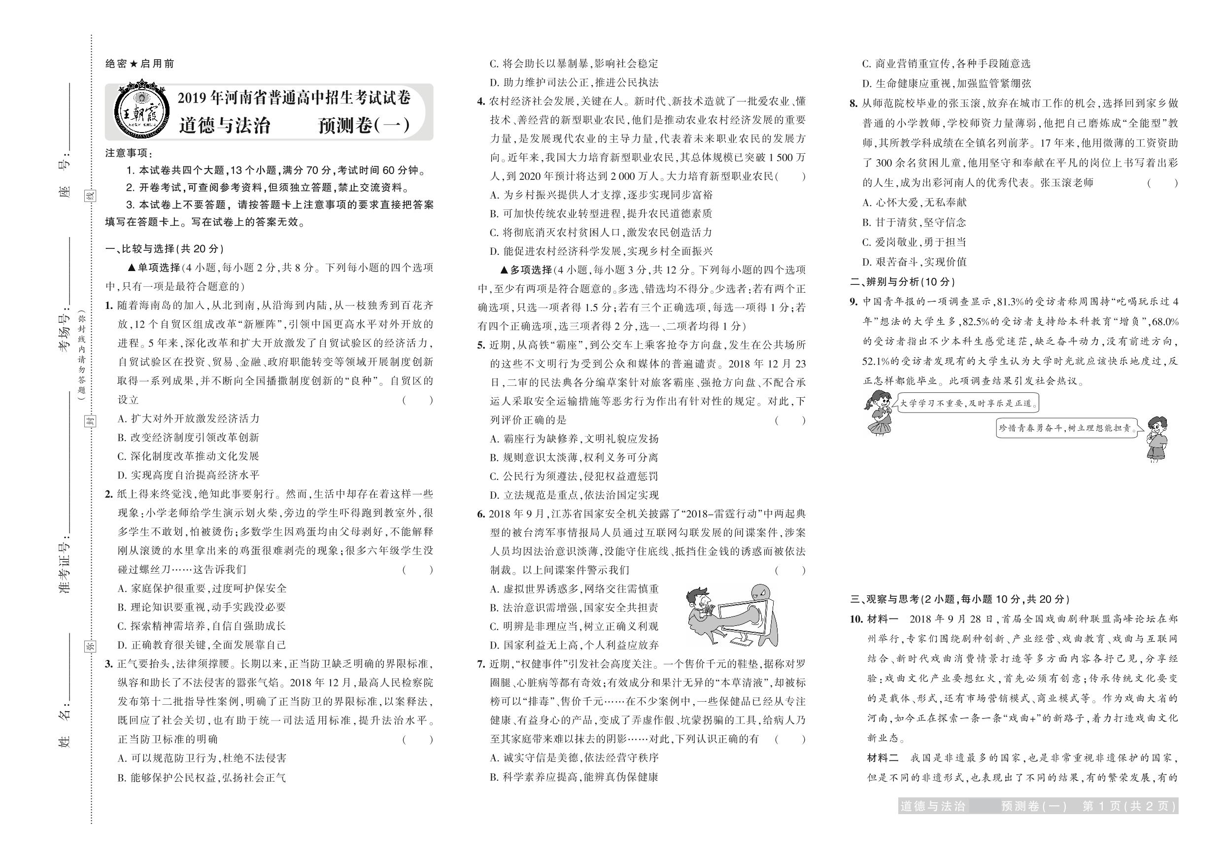 2019年河南省普通高中招生考试试卷道德与法治·预测卷(一)