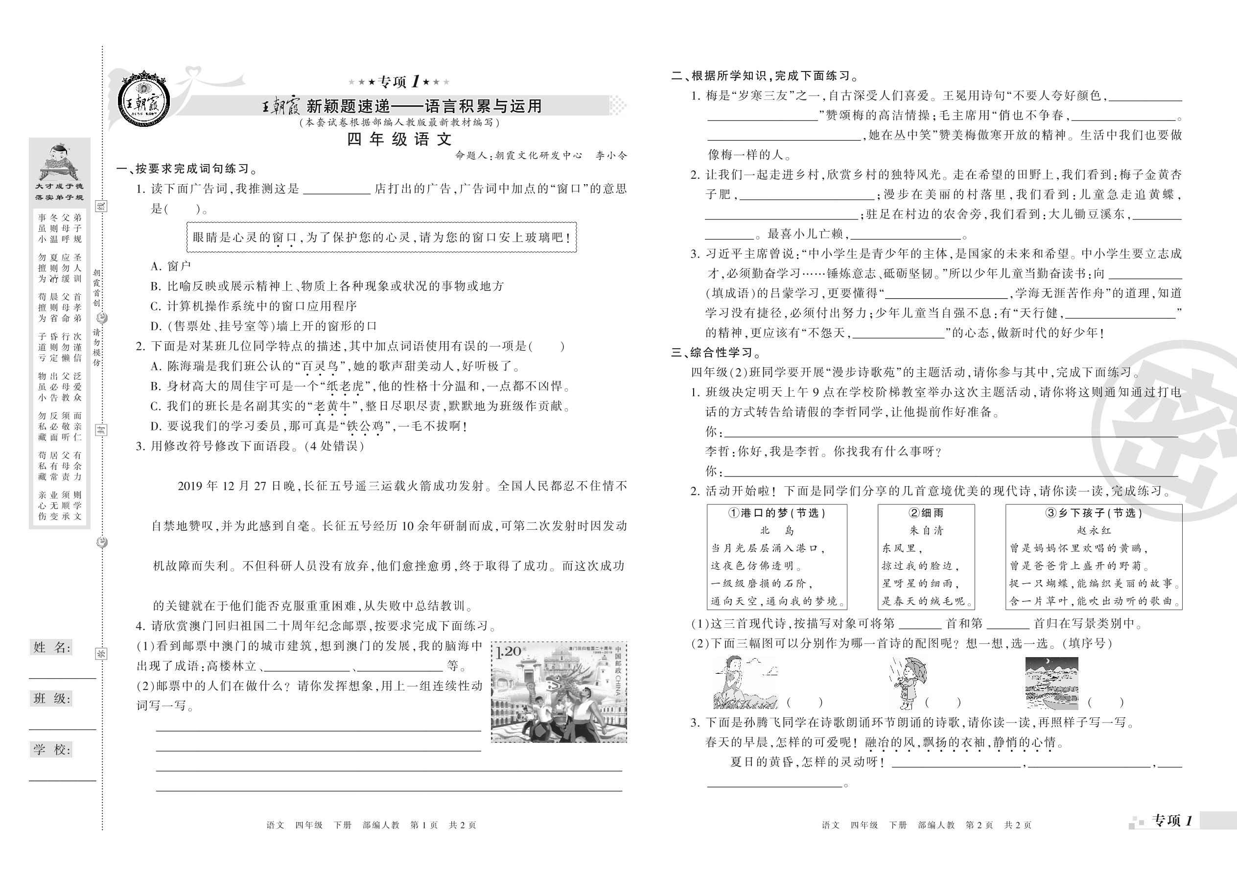 王朝霞期末专项卷——新颖题速递:语言积累与运用、非连续性文本阅读四年级下册语文(人教版)_R210801194041【0】