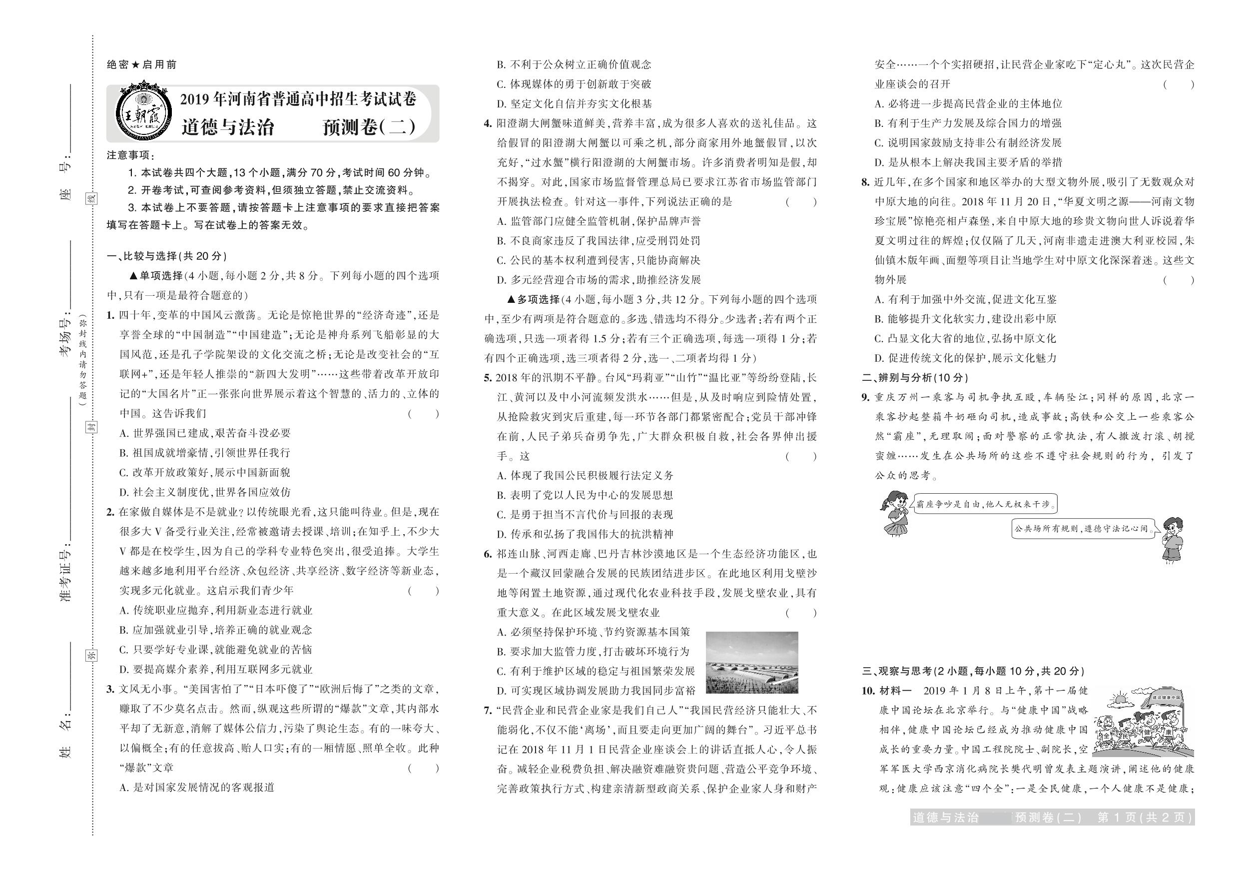 2019年河南省普通高中招生考试试卷道德与法治·预测卷(二)