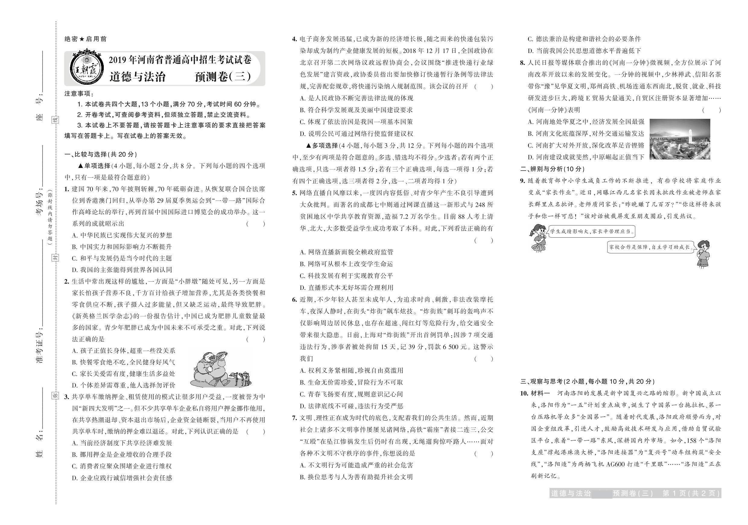 2019年河南省普通高中招生考试试卷道德与法治·预测卷(三)