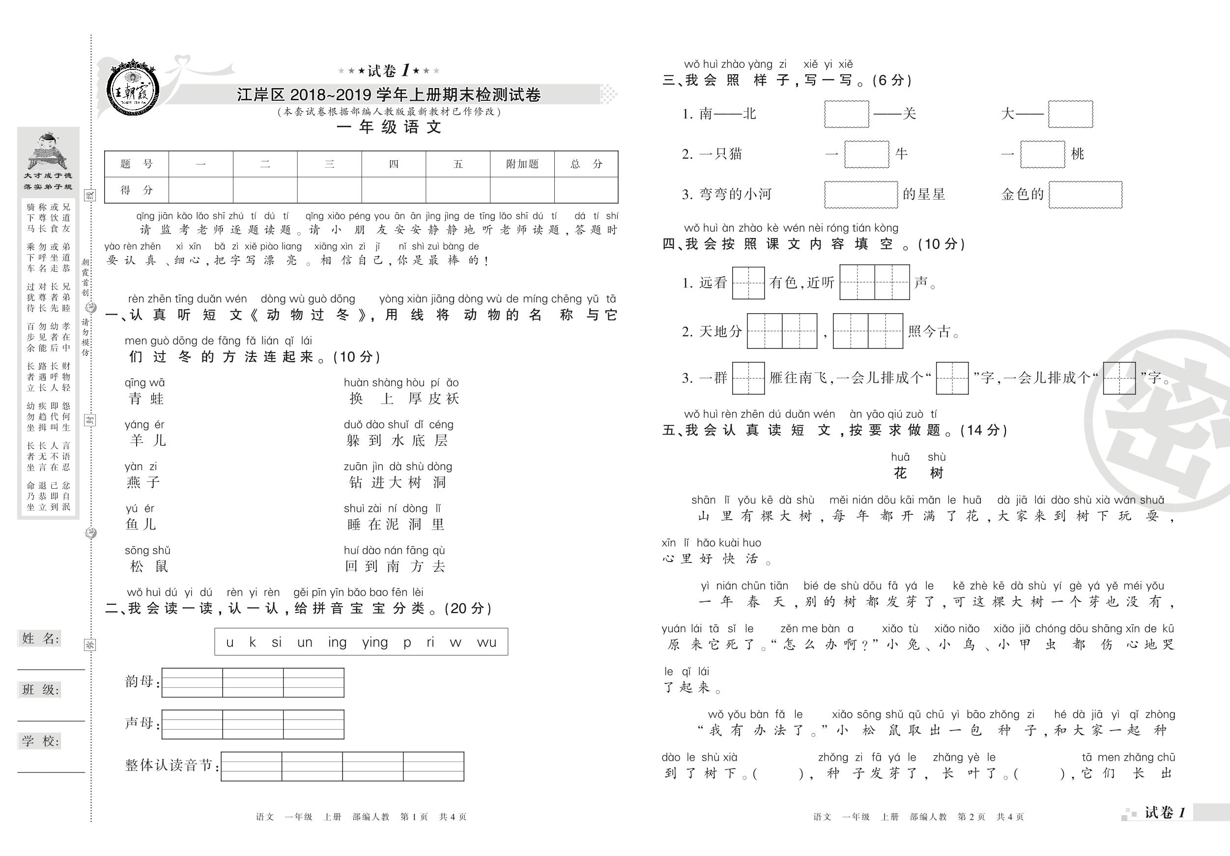 2018-2019学年第一学期武汉市江岸区一年级语文试卷(人教版)【1】