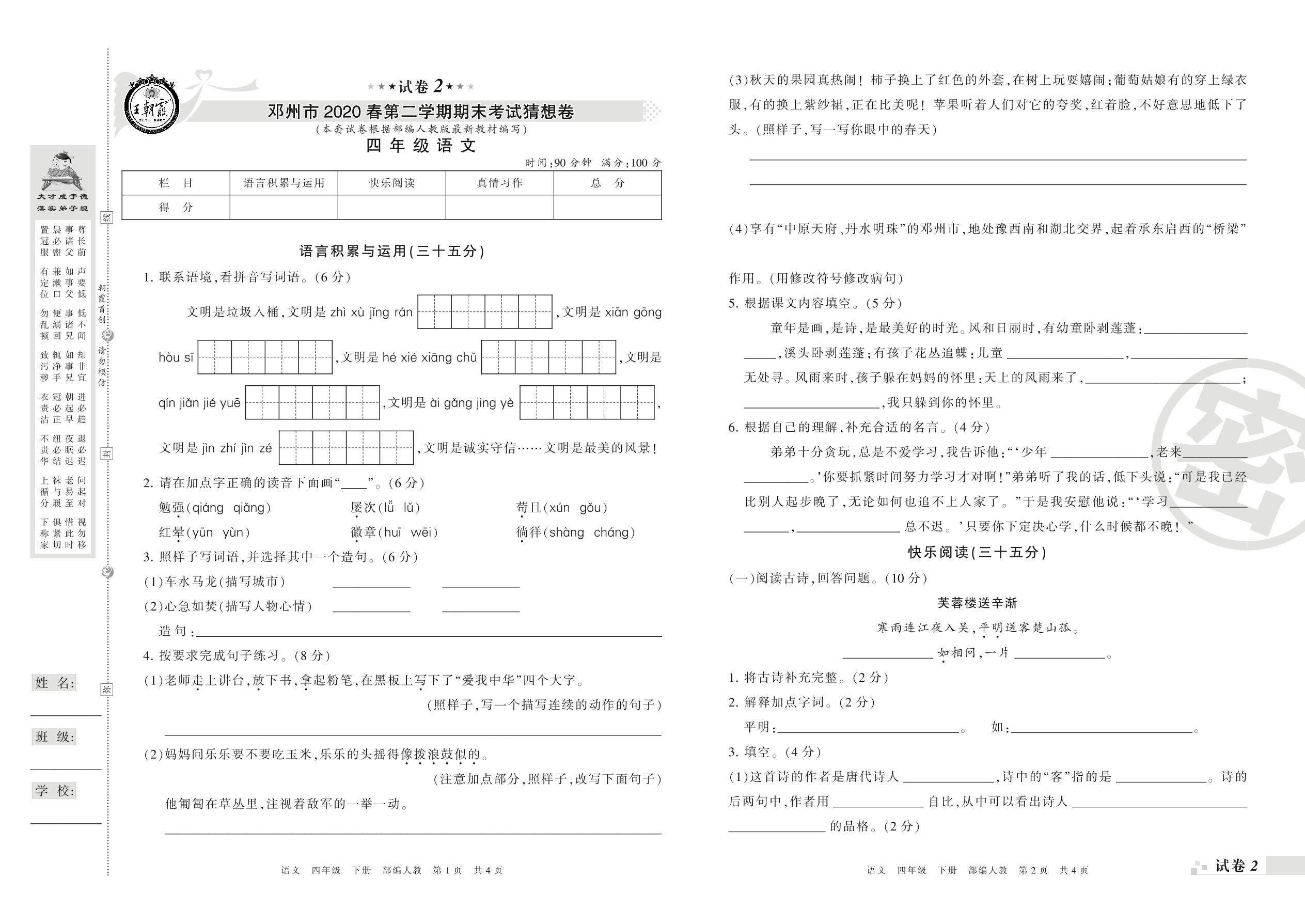 2018-2019学年第二学期邓州市猜想卷四年级语文试卷(人教版)【2】
