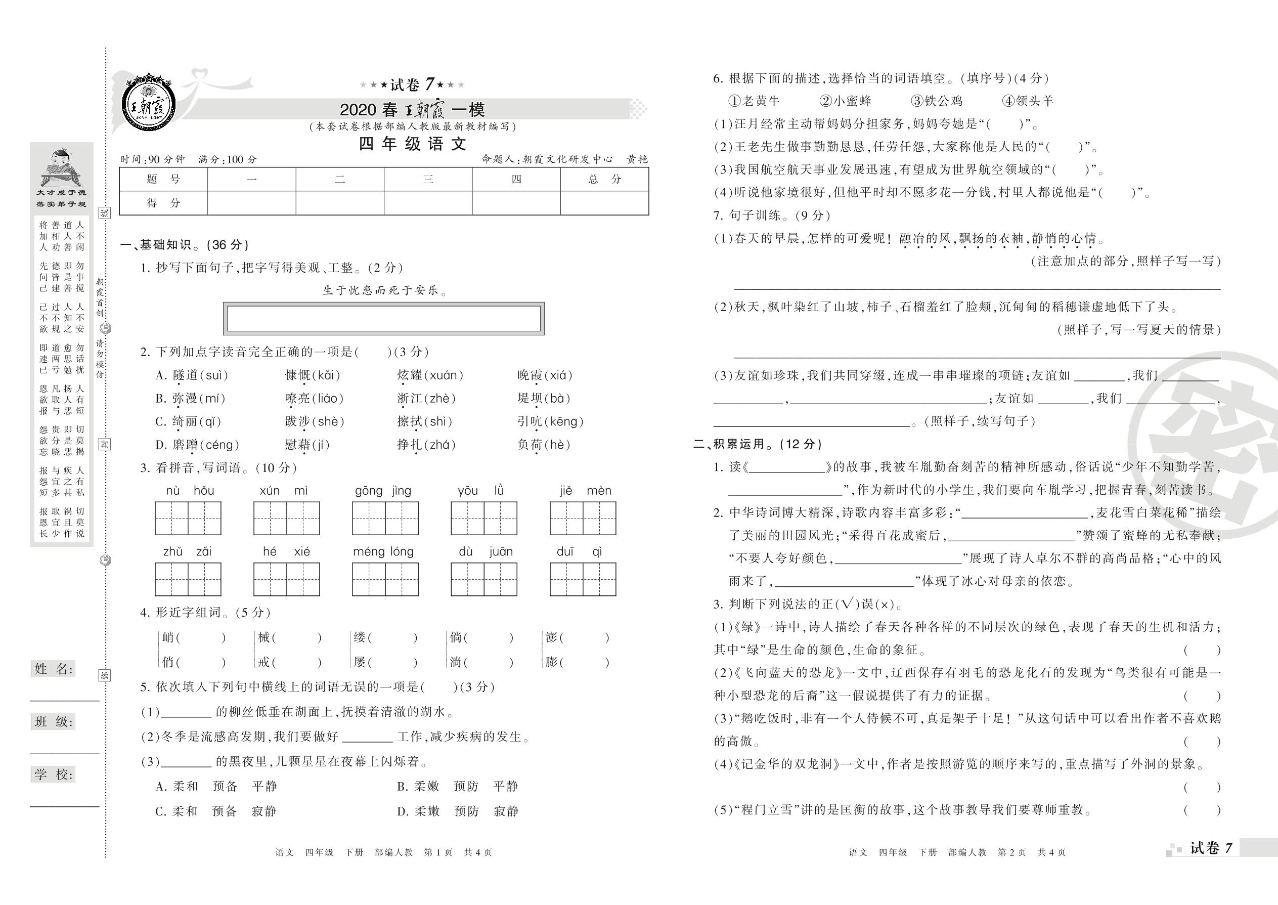 王朝霞期末模拟卷四年级下册语文(人教版)_R210801194142【7】