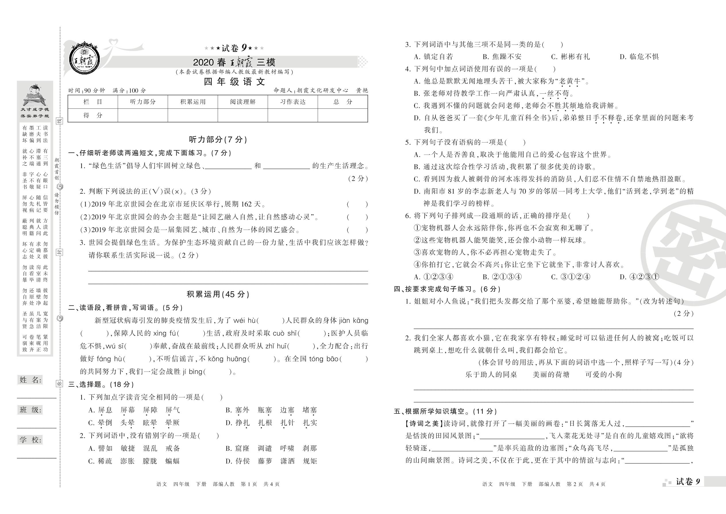 王朝霞期末模拟卷四年级下册语文(人教版)_R210801194201【9】