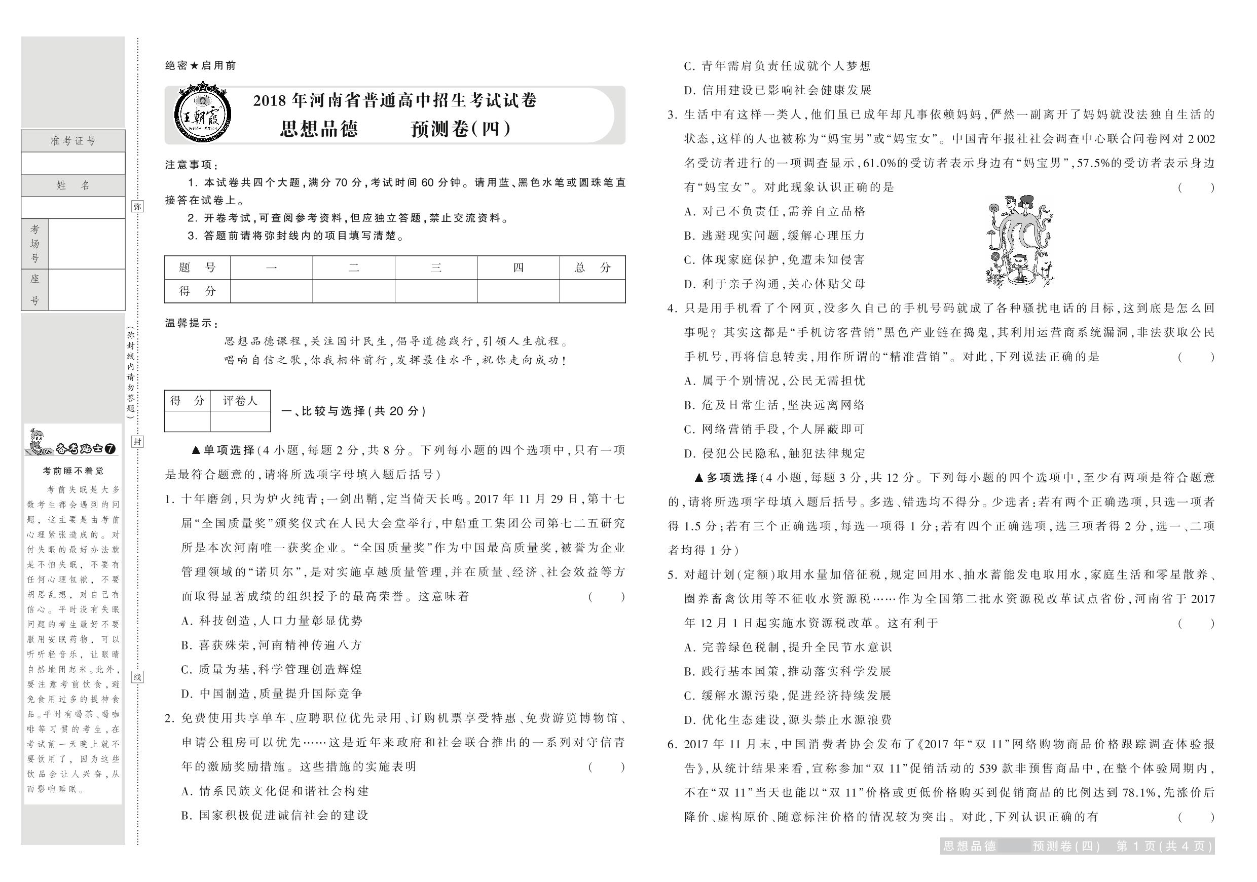 2018年河南省普通高中招生考试试卷思想品德·预测卷(四)
