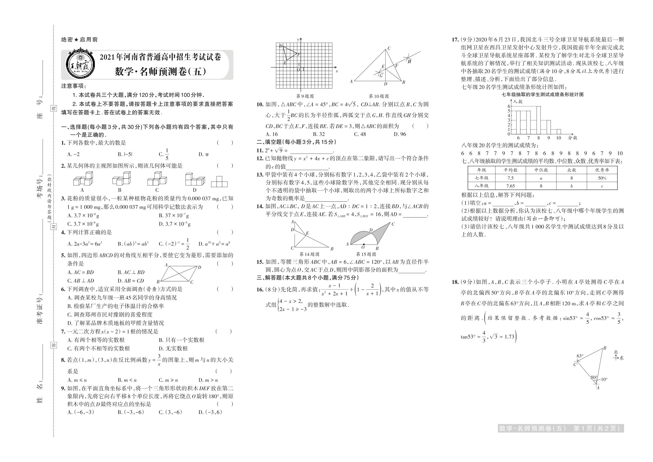 2021年河南省普通高中招生考试试卷数学·预测卷(五)