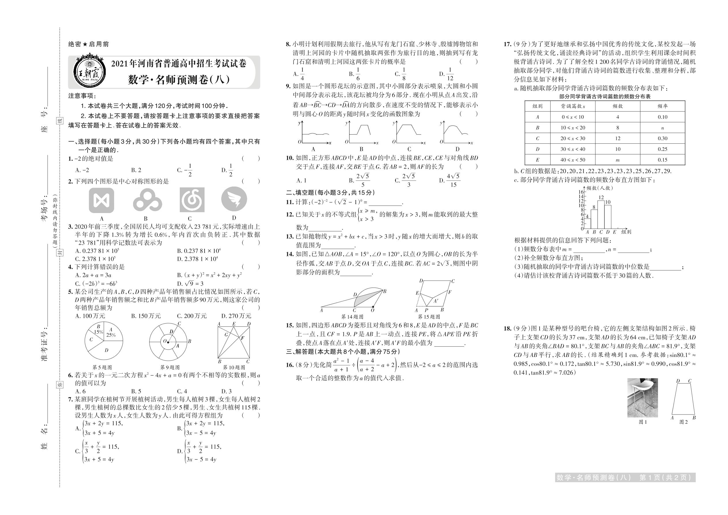 2021年河南省普通高中招生考试试卷数学·预测卷(八)