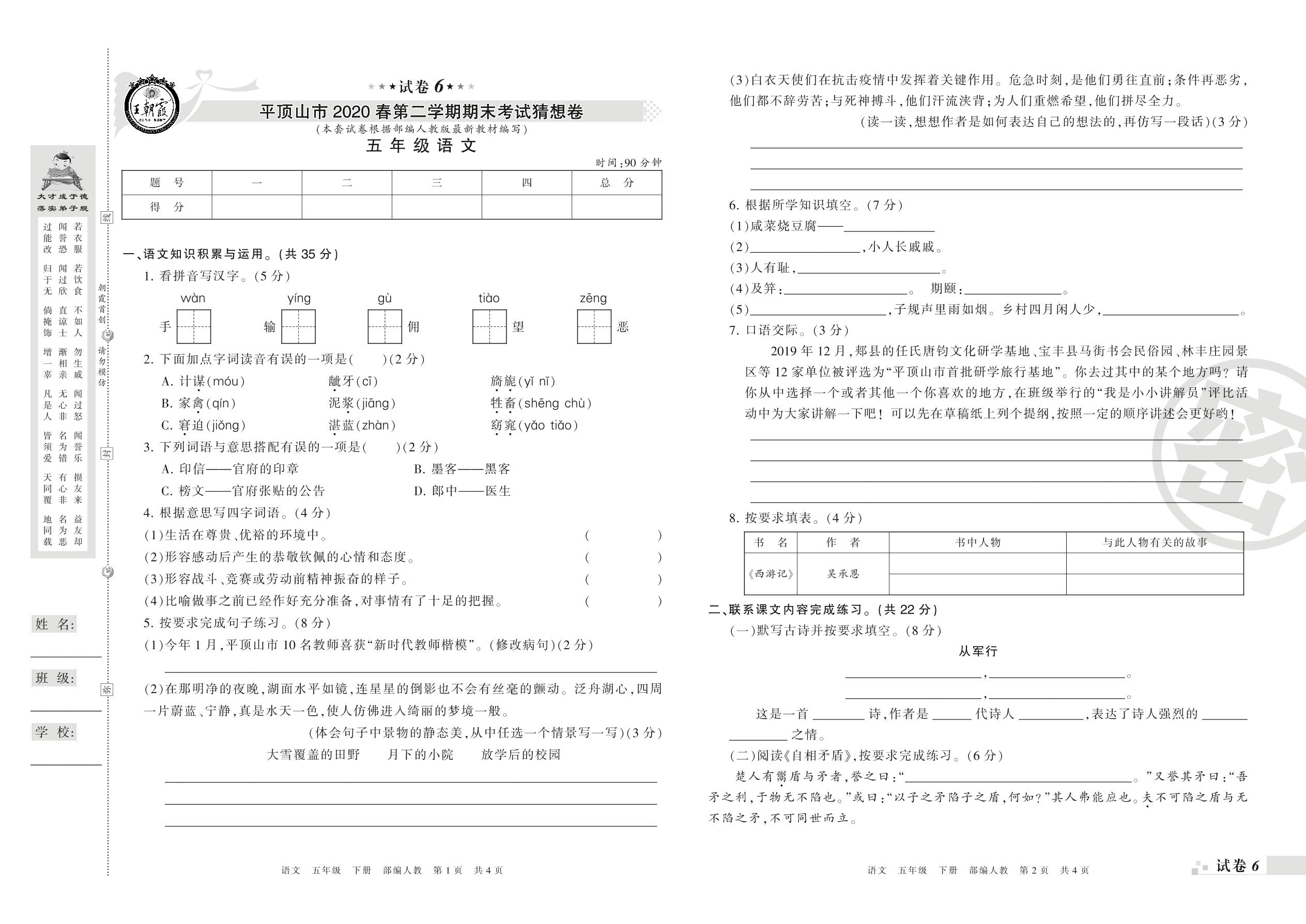 2018-2019学年第二学期平顶山市猜想卷五年级语文试卷(人教版)【6】