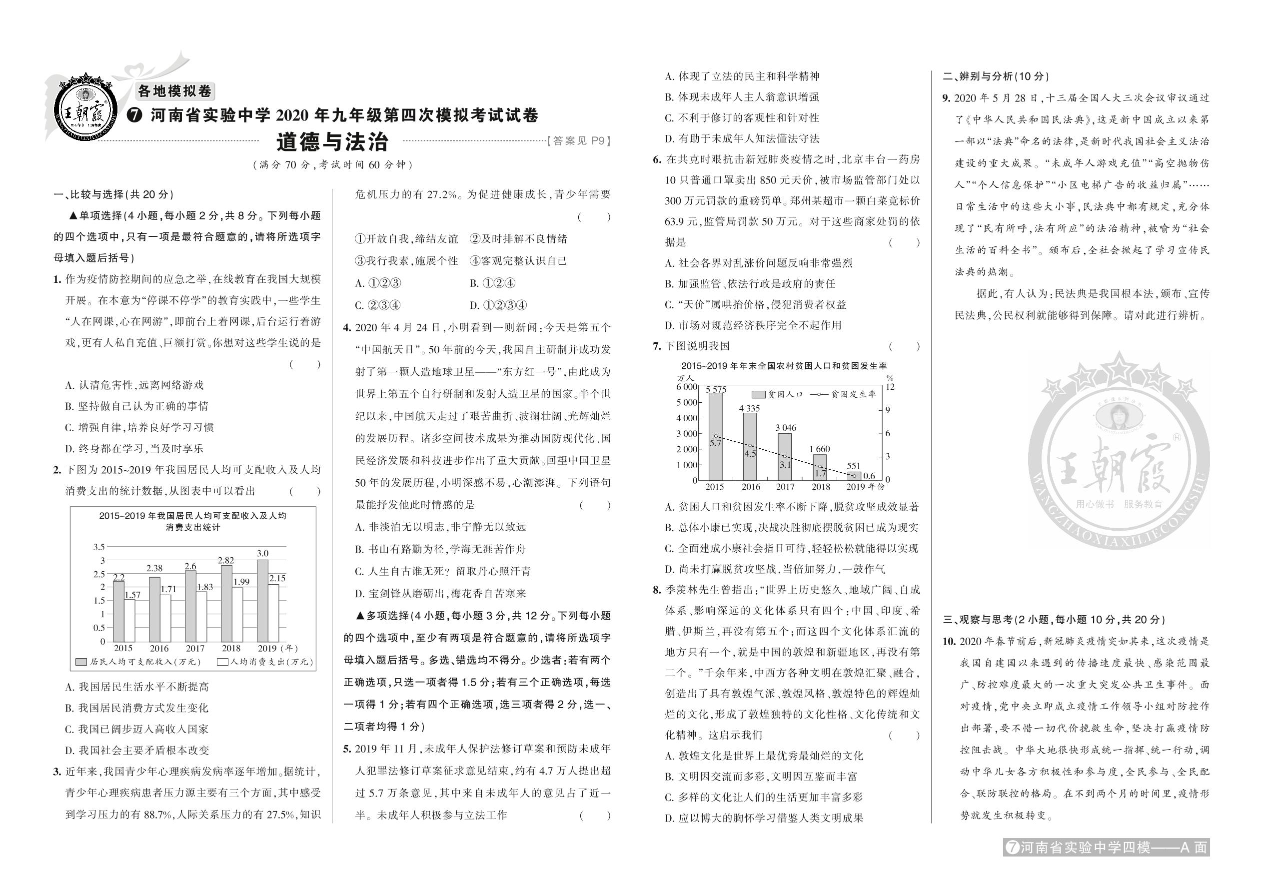 河南省实验中学2020年九年级第四次模拟考试试卷道德与法治【7】