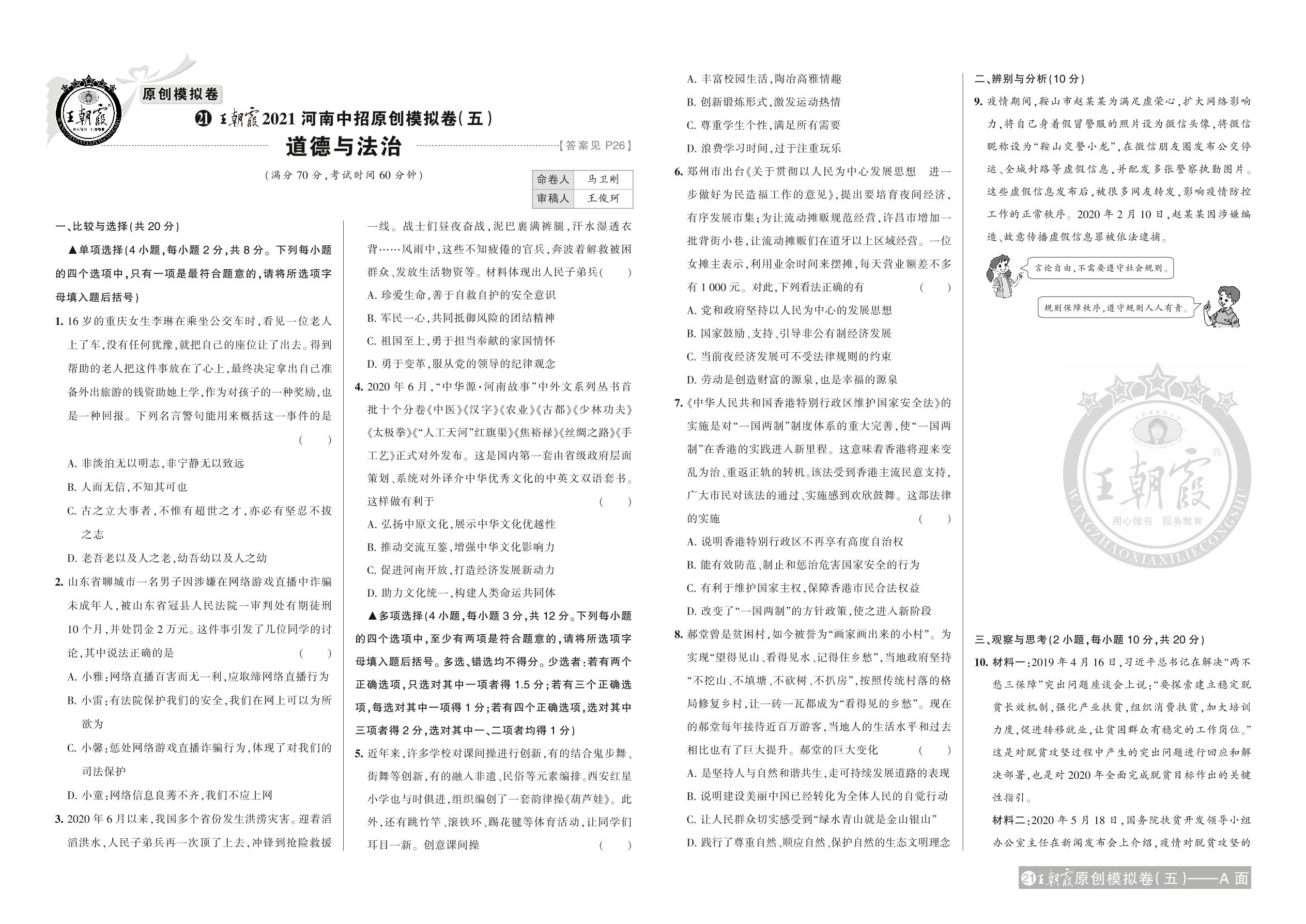 王朝霞2021河南中招原创模拟卷(五)道德与法治【21】