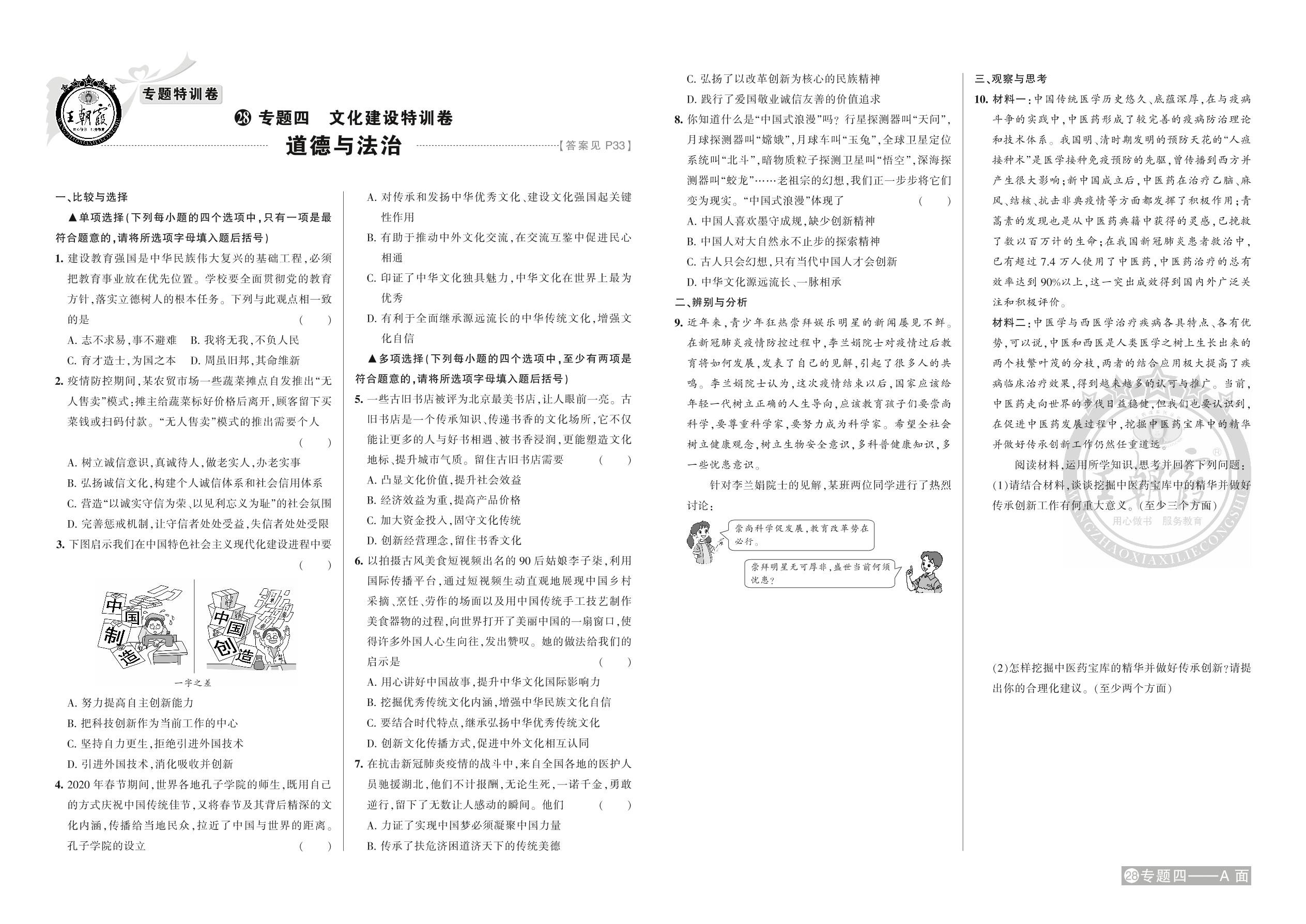 2021年河南中考道德与法治特训卷——专题四 文化建设【28】