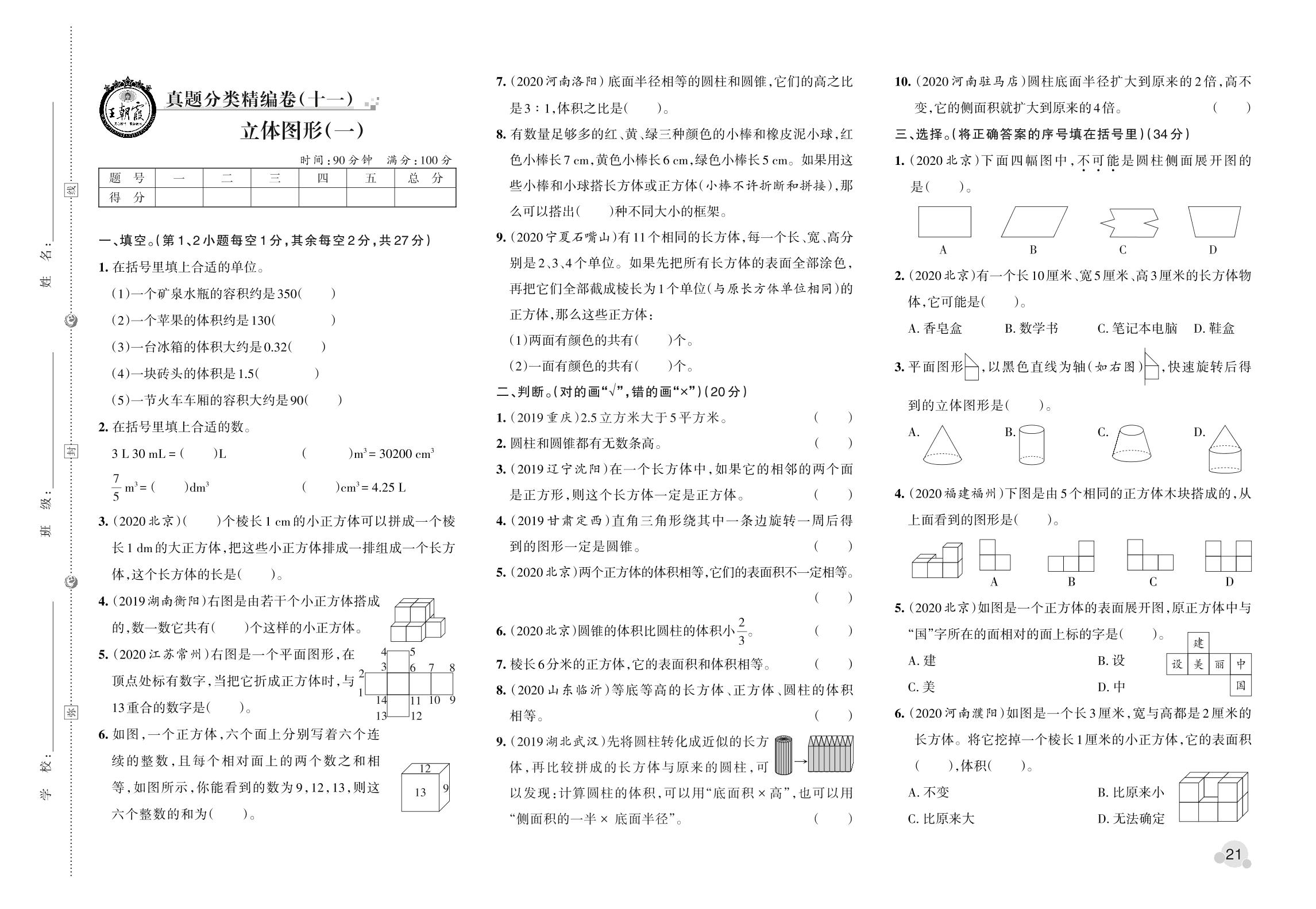 小升初数学真题分类·王朝霞精编卷——立体图形(一)_R211017083712968【11】