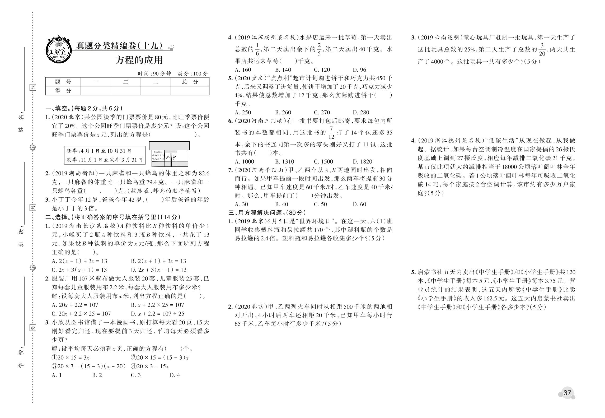 小升初数学真题分类·王朝霞精编卷——方程的应用【19】