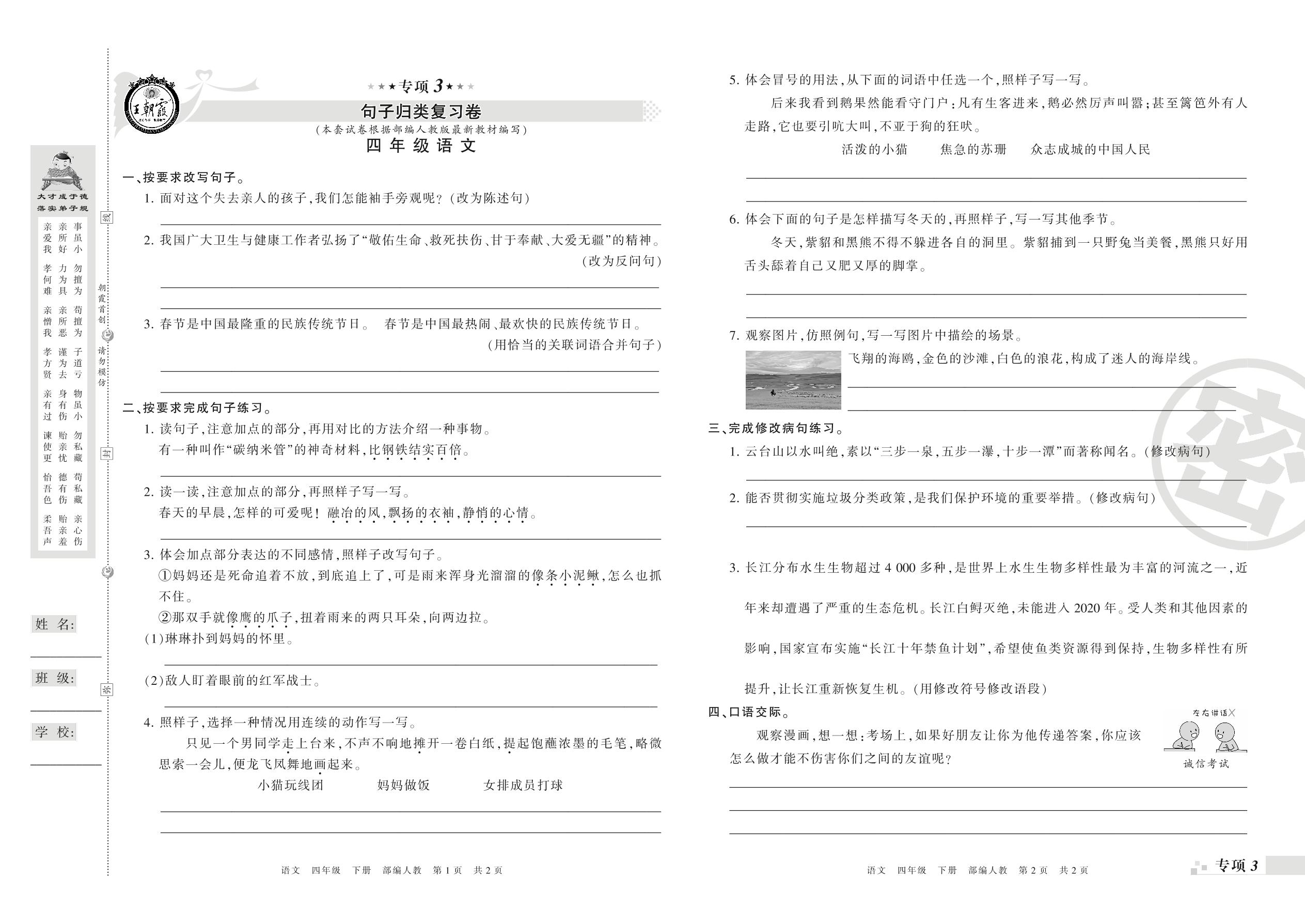 王朝霞期末专项卷——句子、课文内容与积累运用真题归类复习卷四年级下册语文(人教版)_R210801194325【0】