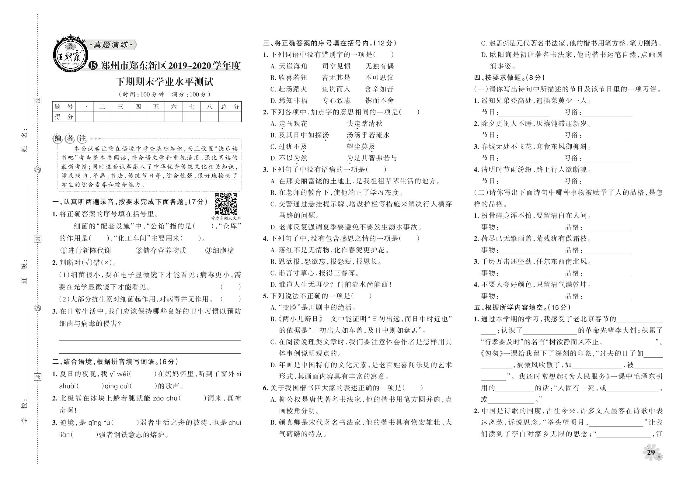 小升初语文郑州市郑东新区2019~2020学年度下期期末学业水平测试【15】