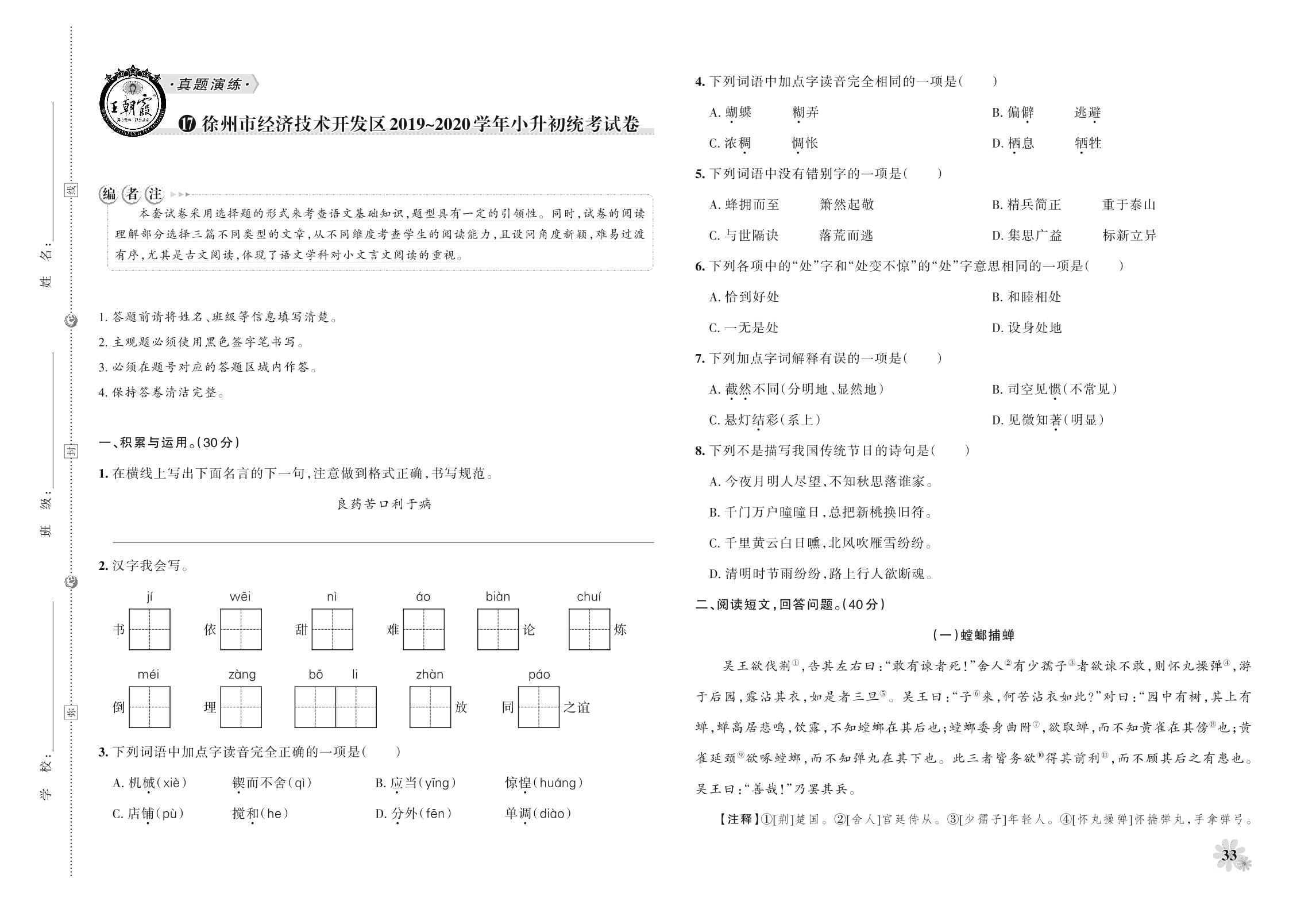 小升初语文徐州市经济技术开发区2019~2020学年小升初统考试卷【17】
