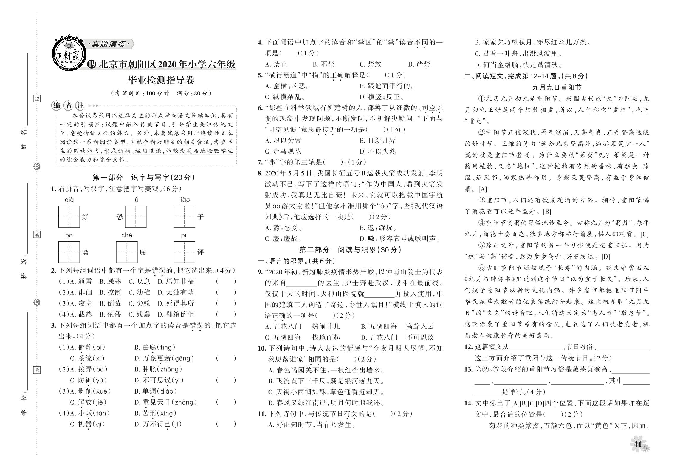 小升初语文北京市朝阳区2020年小学六年级毕业检测指导卷【19】