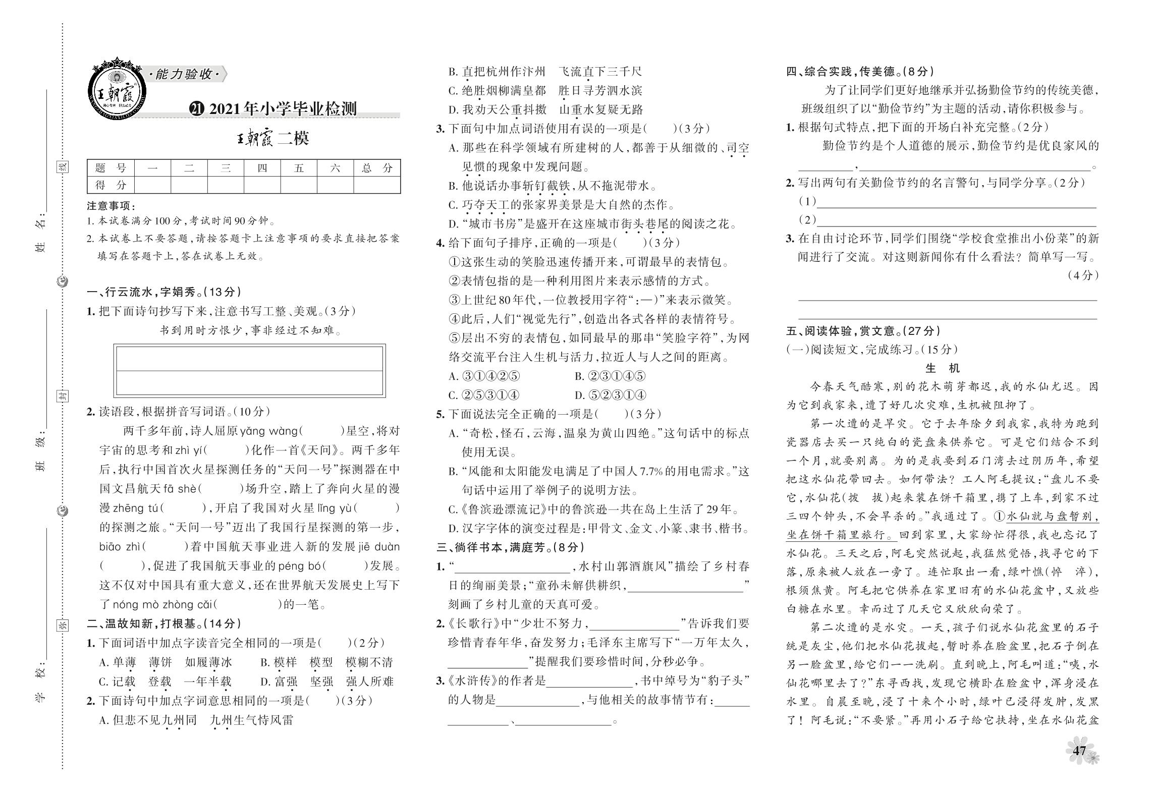小升初语文小学毕业检测·王朝霞模拟卷【21】