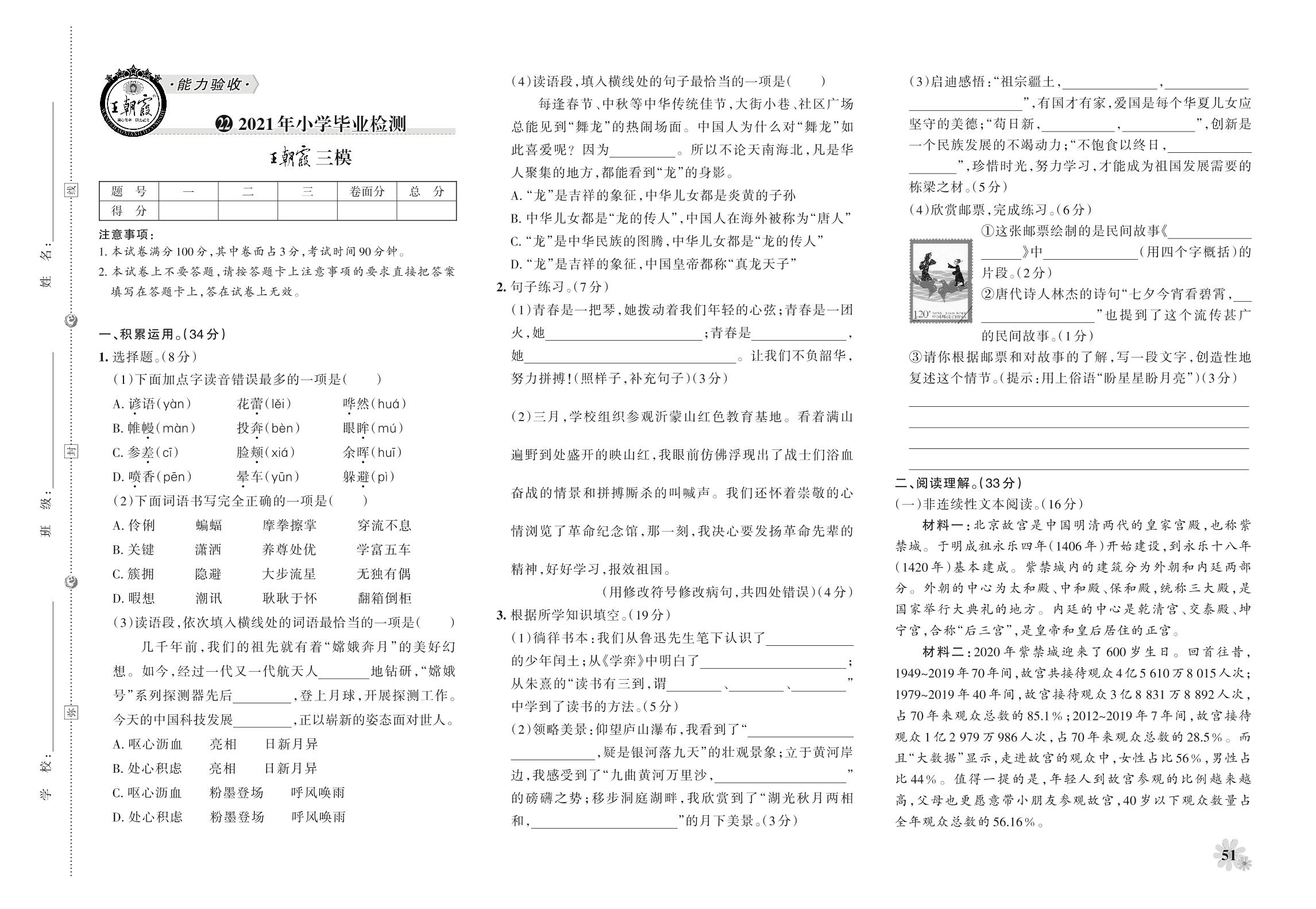 小升初语文小学毕业检测·王朝霞模拟卷【22】