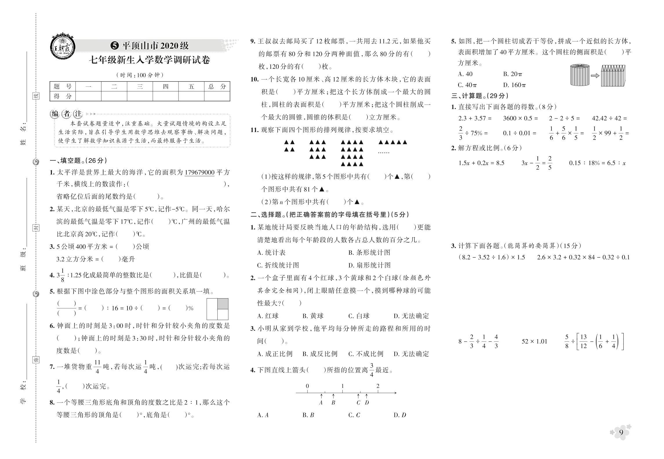 小升初数学平顶山市2020级七年级新生入学数学调研试卷【5】