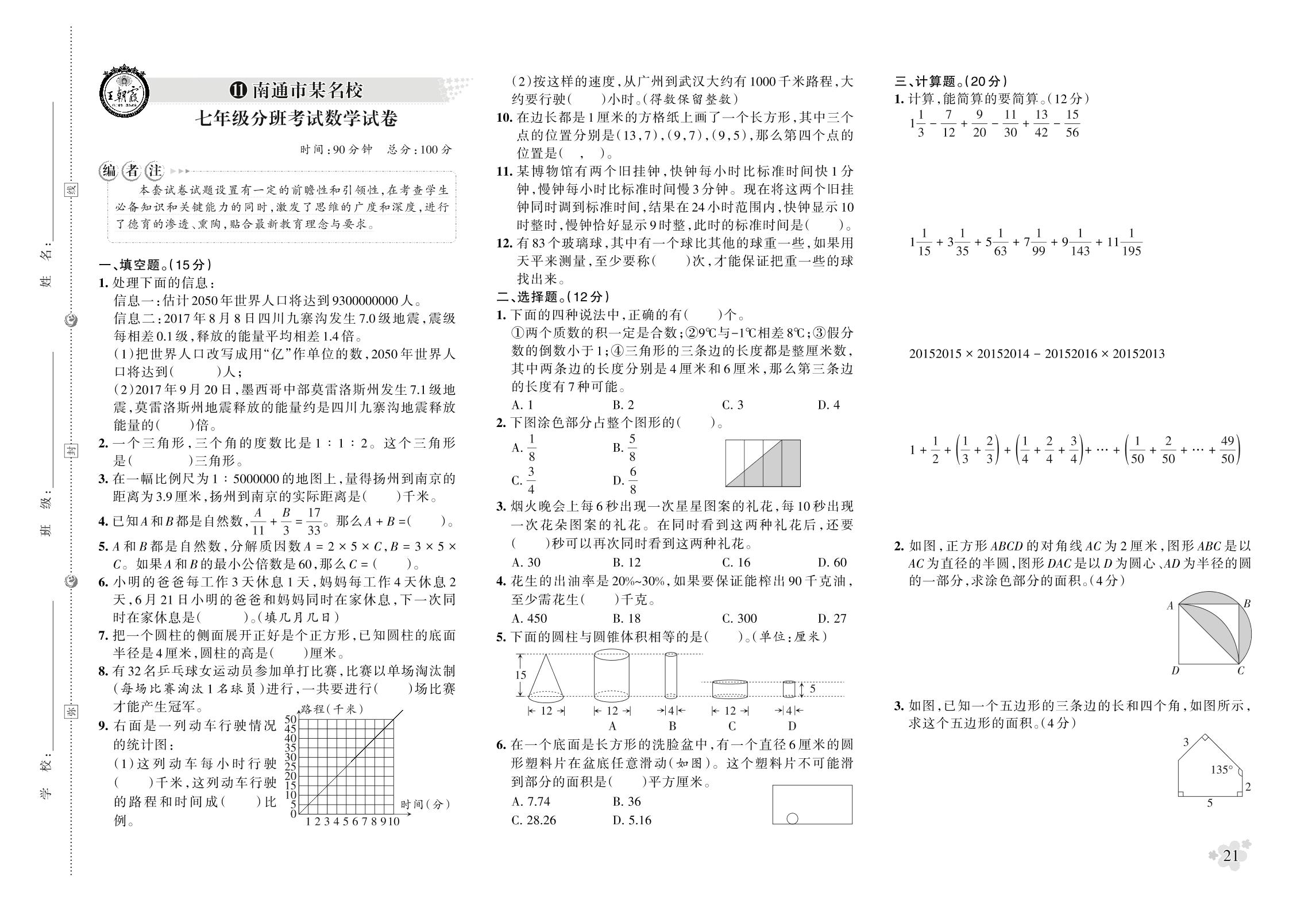 小升初数学南通市某名校七年级分班考试数学试卷【11】