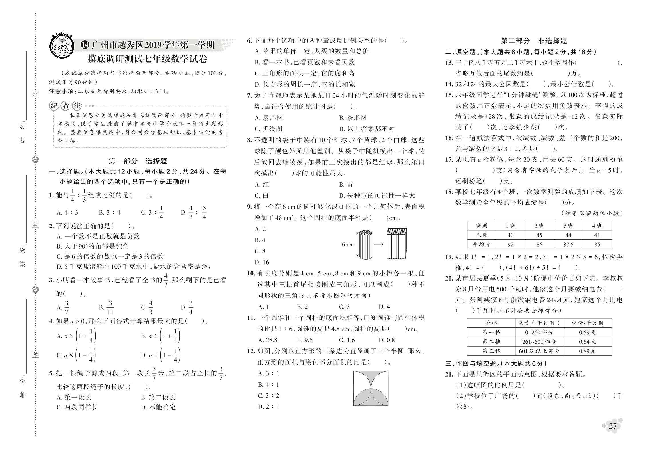 小升初数学广州市越秀区2019学年第一学期摸底调研测试七年级数学试卷【14】