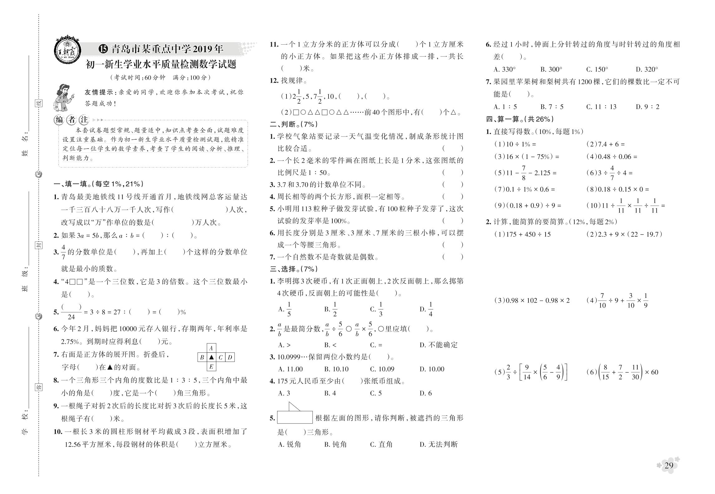 小升初数学青岛市某重点中学2019年初一新生学业水平质量检测数学试题【15】