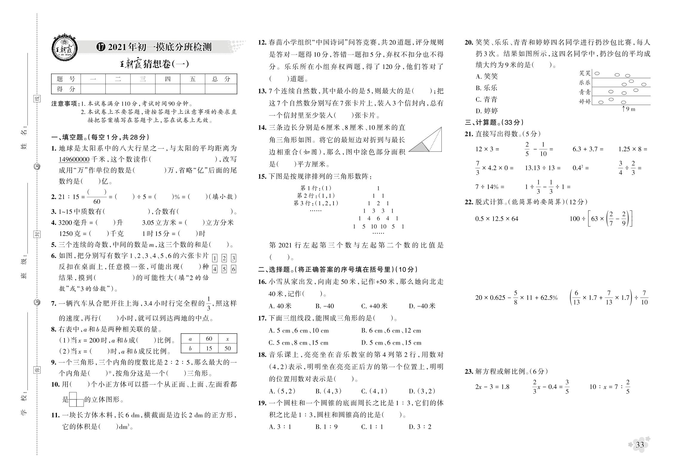 小升初数学初一摸底分班检测王朝霞猜想卷(一)【17】