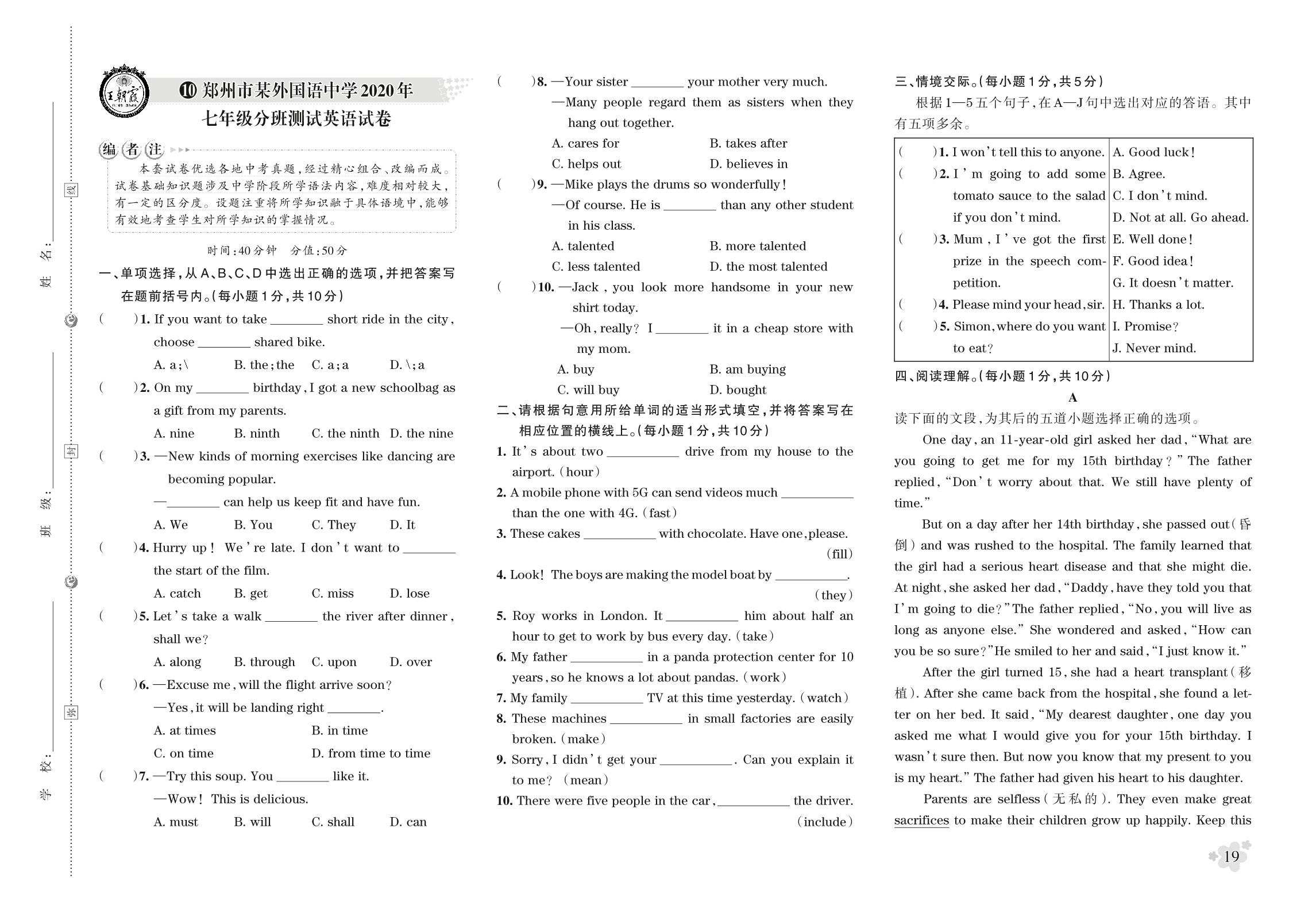 小升初英语郑州市某外国语中学2020年七年级分班测试英语试卷【10】