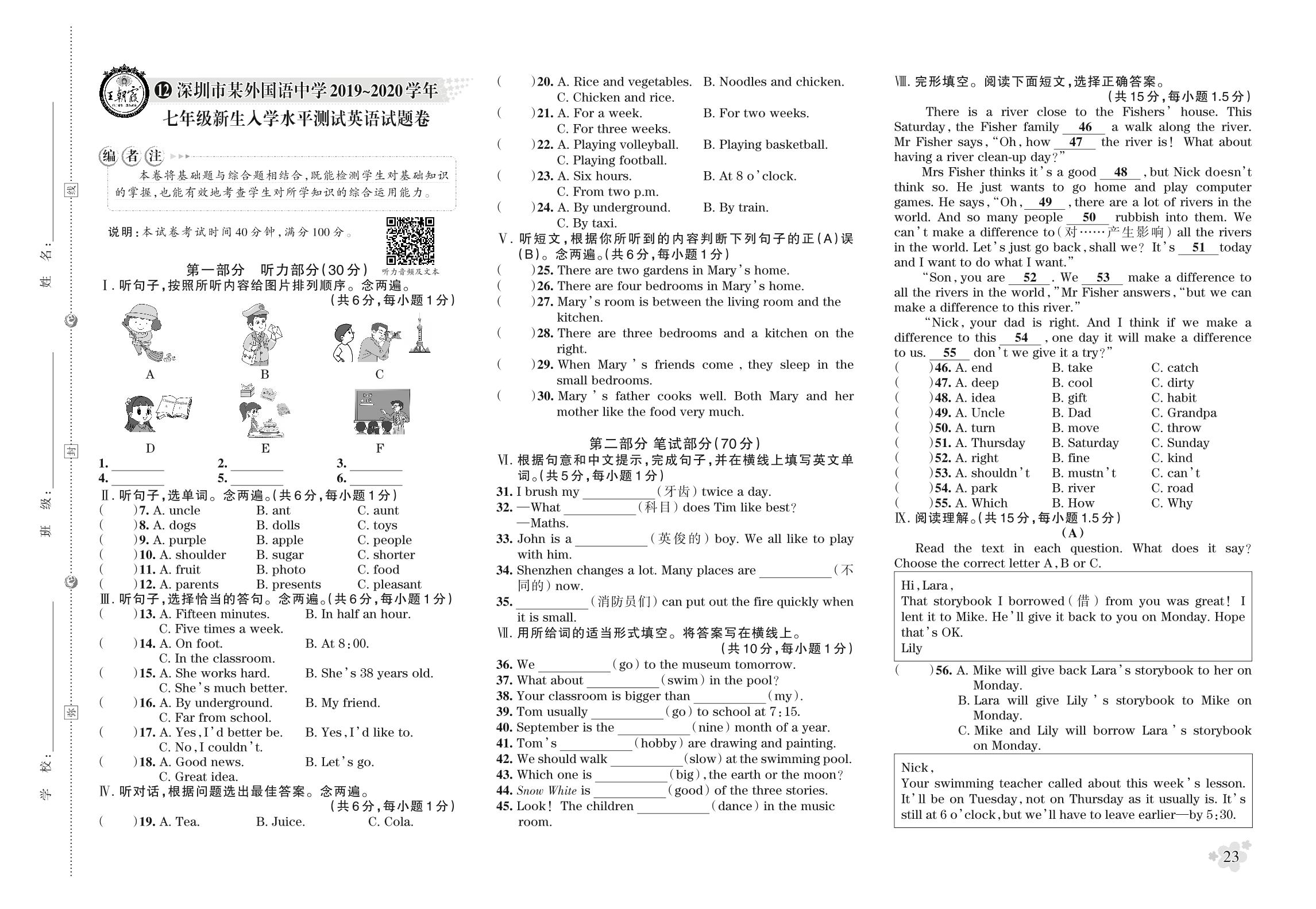 小升初英语深圳市某外国语中学2019~2020学年七年级新生入学水平测试英语试题卷【12】