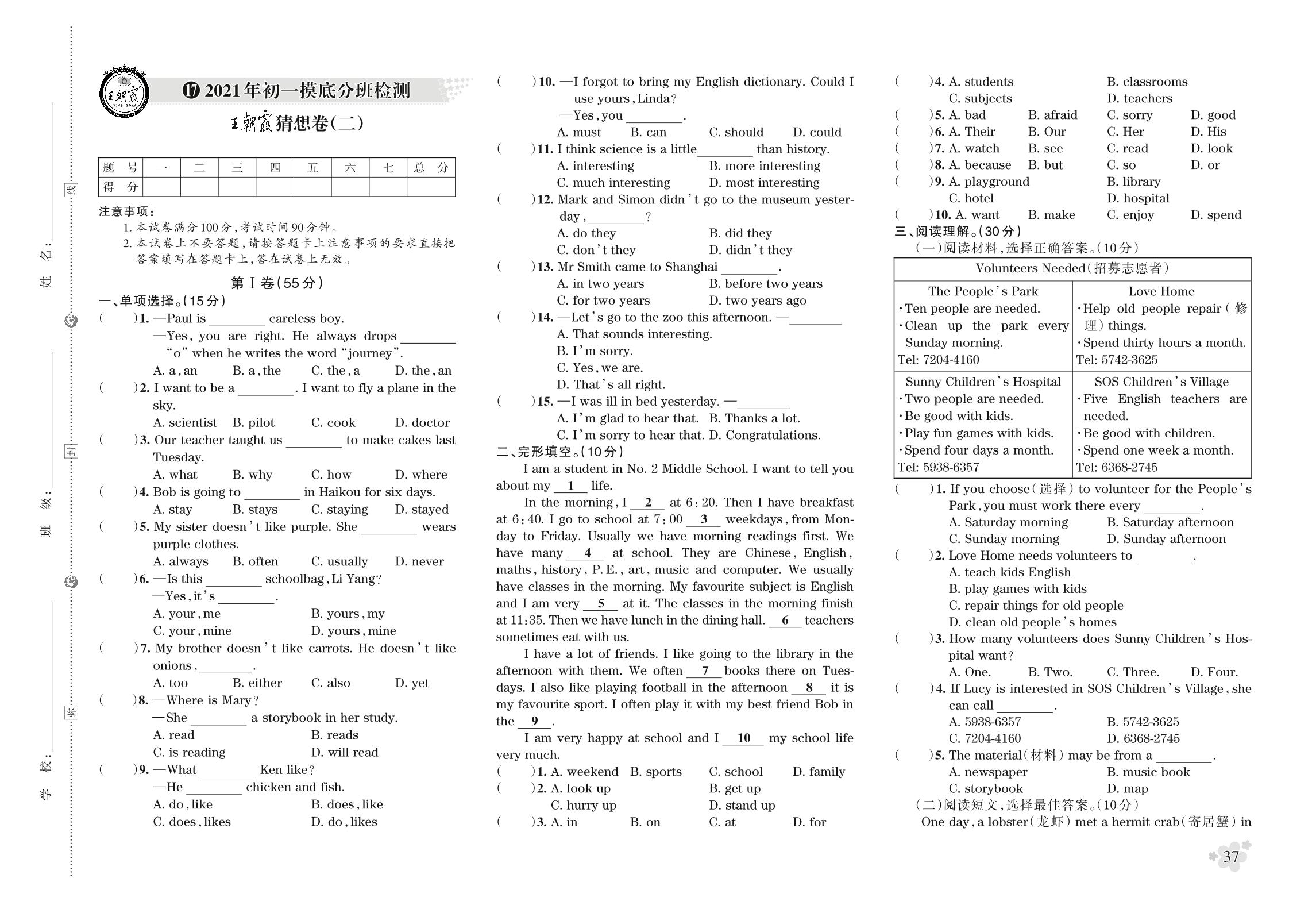 小升初英语初一摸底分班检测王朝霞猜想卷(二)_R211017083004862【17】