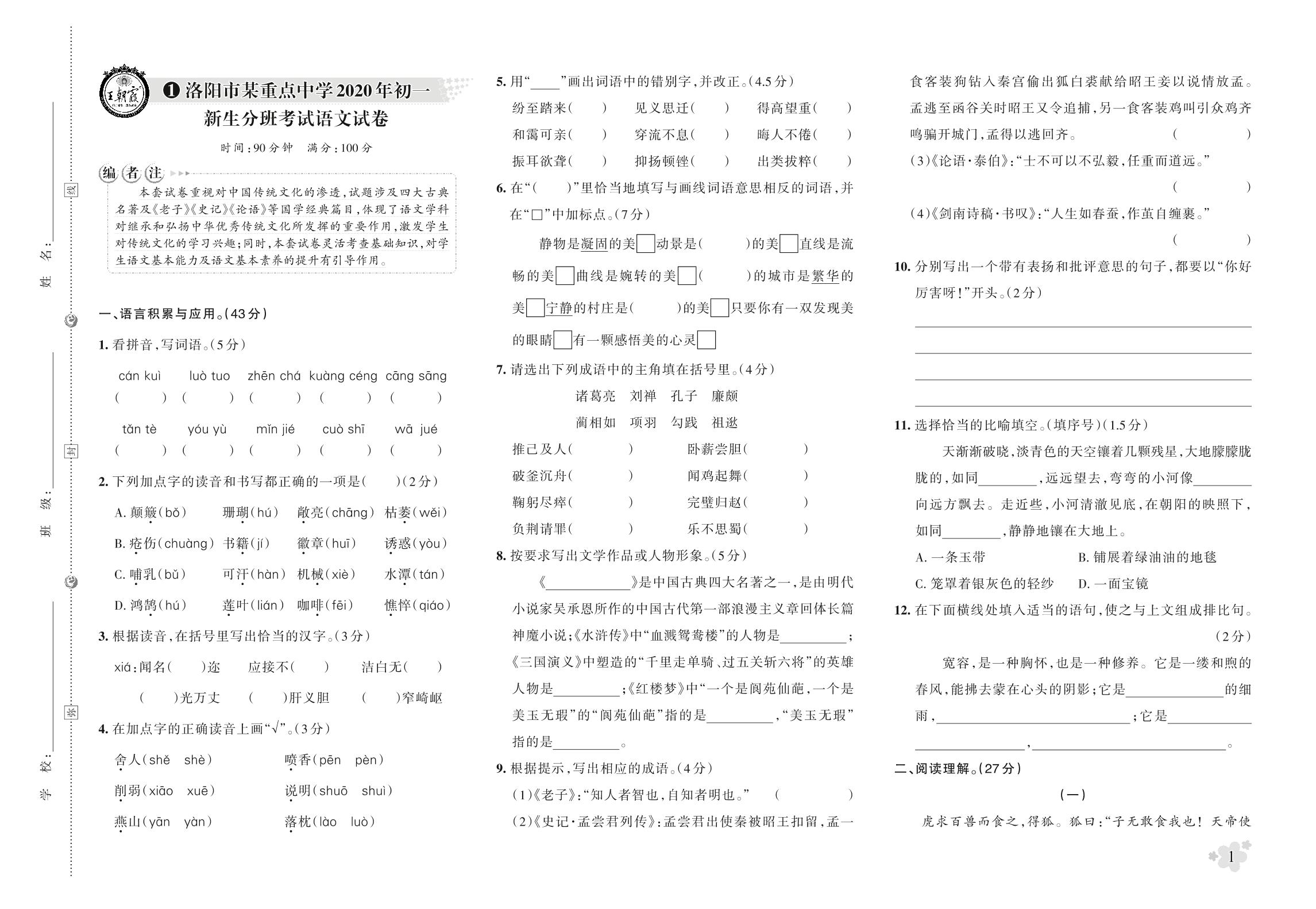 小升初语文洛阳市某重点中学2020年初一新生分班考试语文试卷【1】