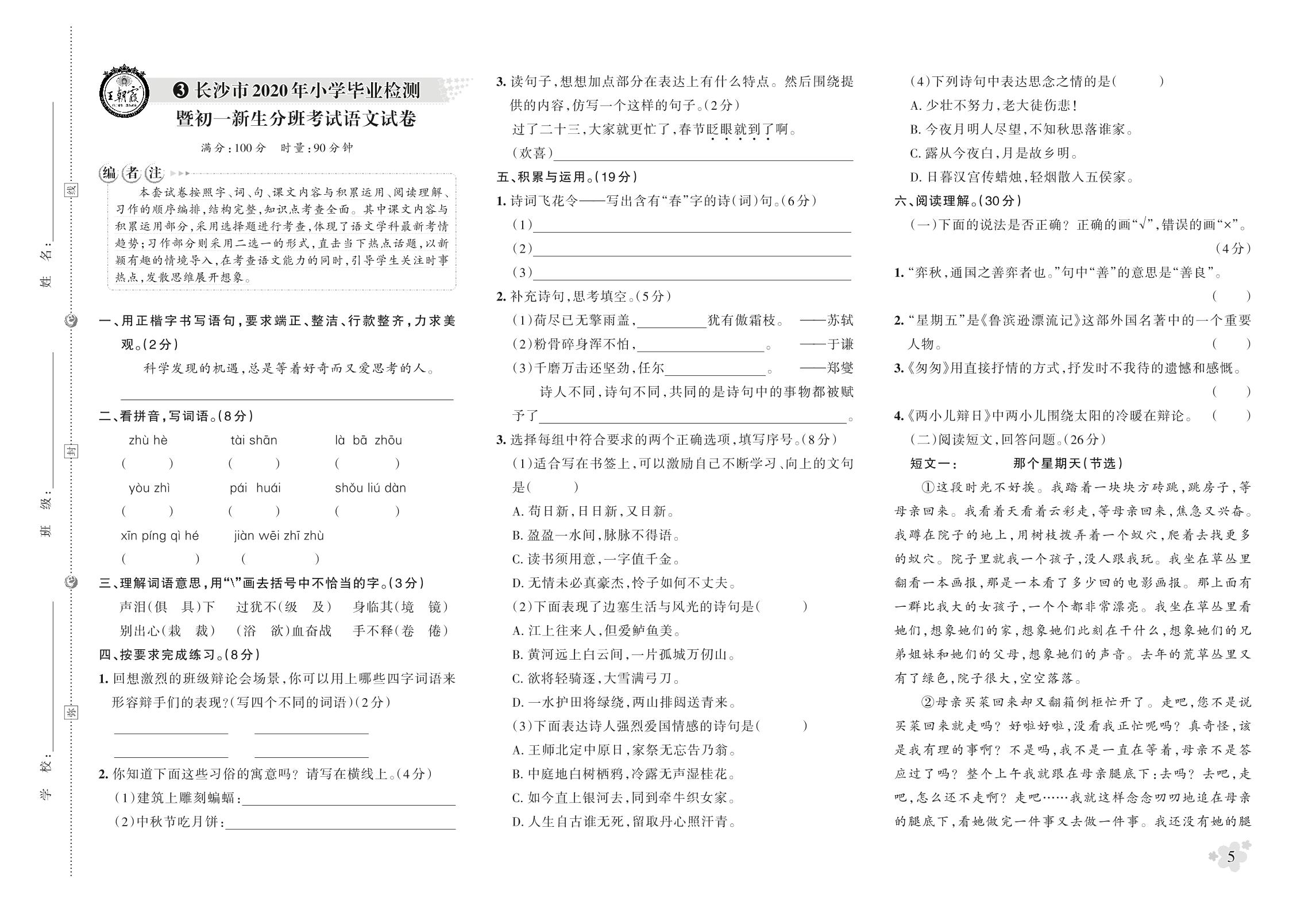 小升初语文长沙市2020年小学毕业检测暨初一新生分班考试语文试卷【3】