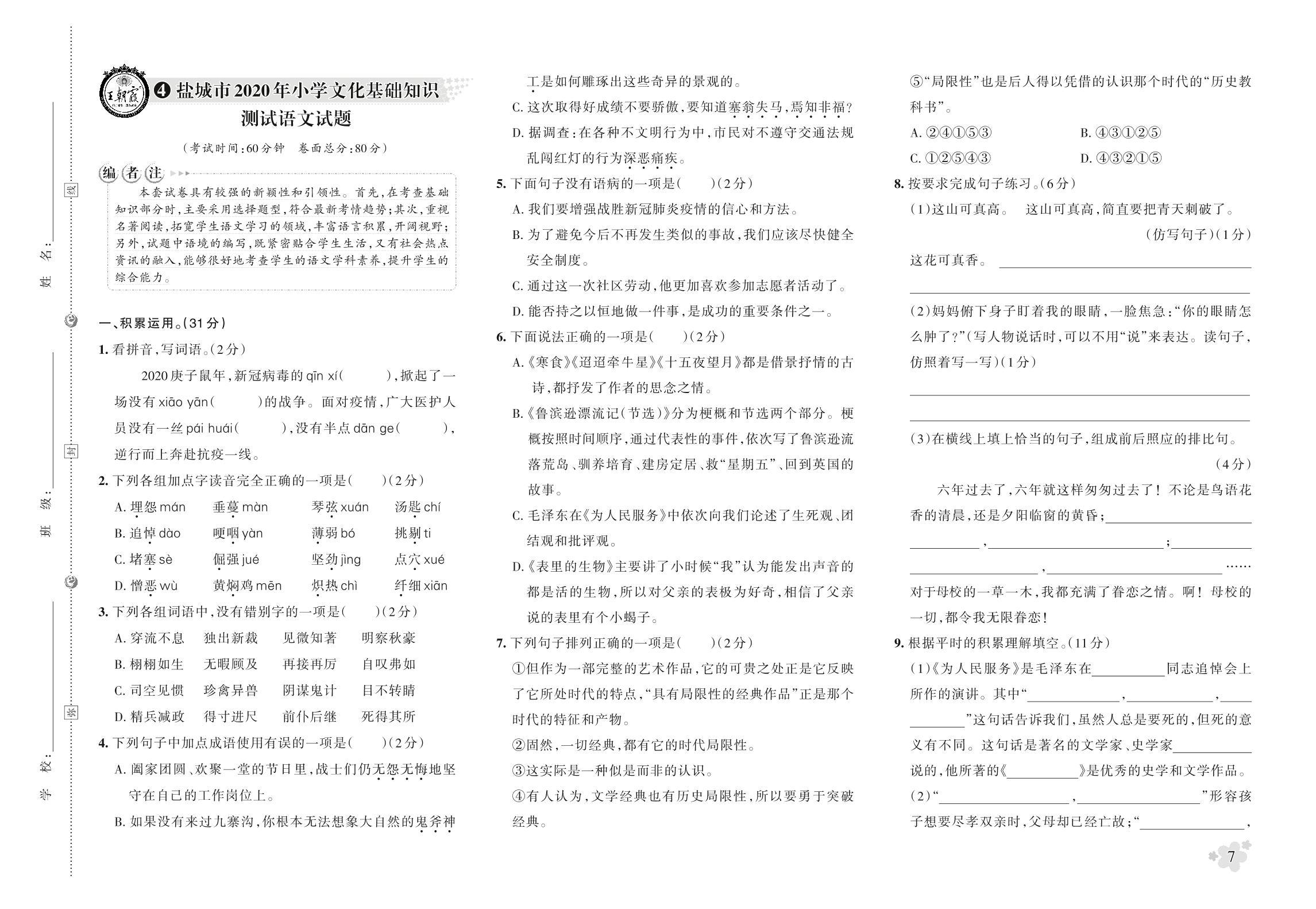 小升初语文盐城市2020年小学文化基础知识测试语文试题【4】