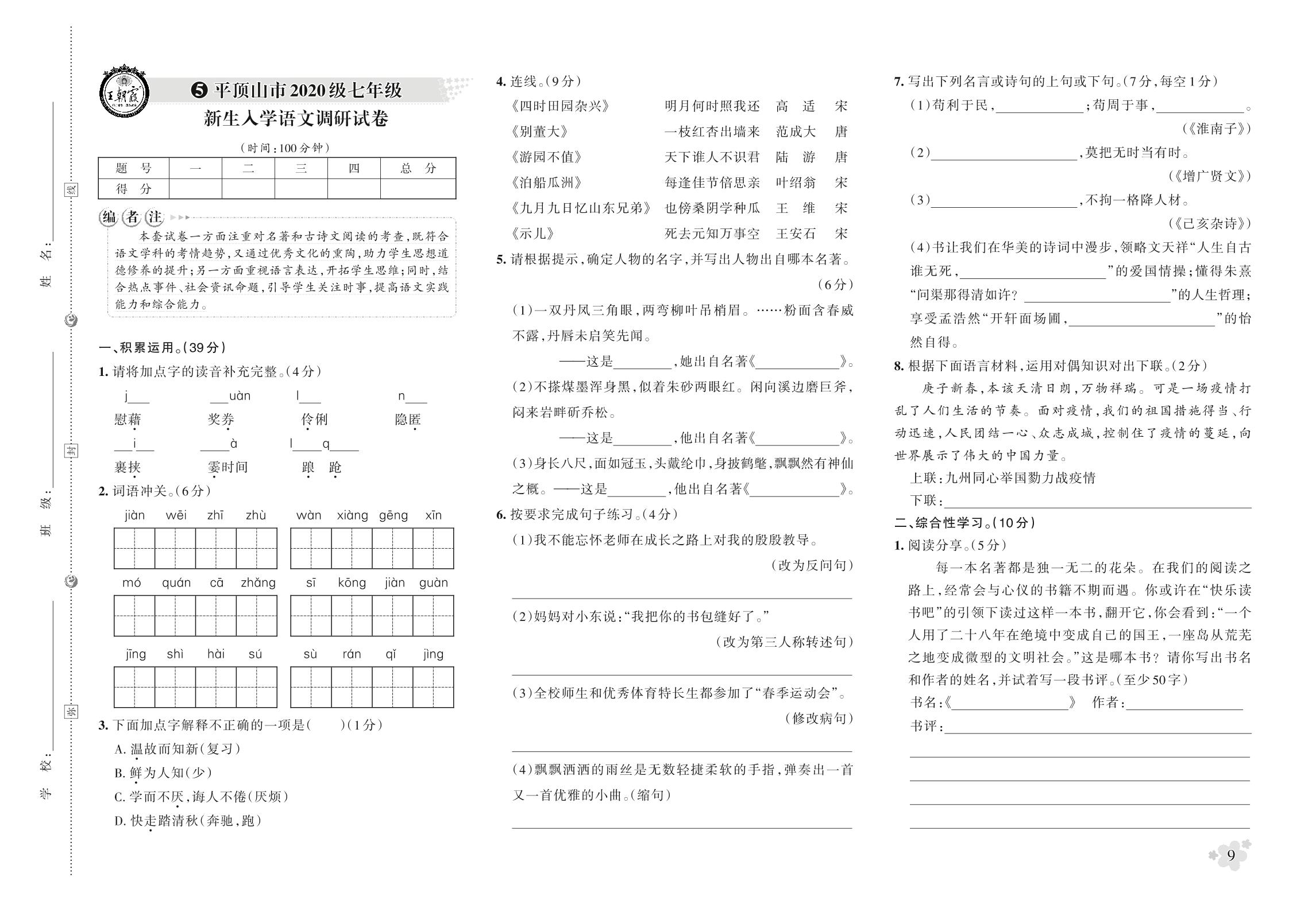 小升初语文平顶山市2020级七年级新生入学语文调研试卷【5】
