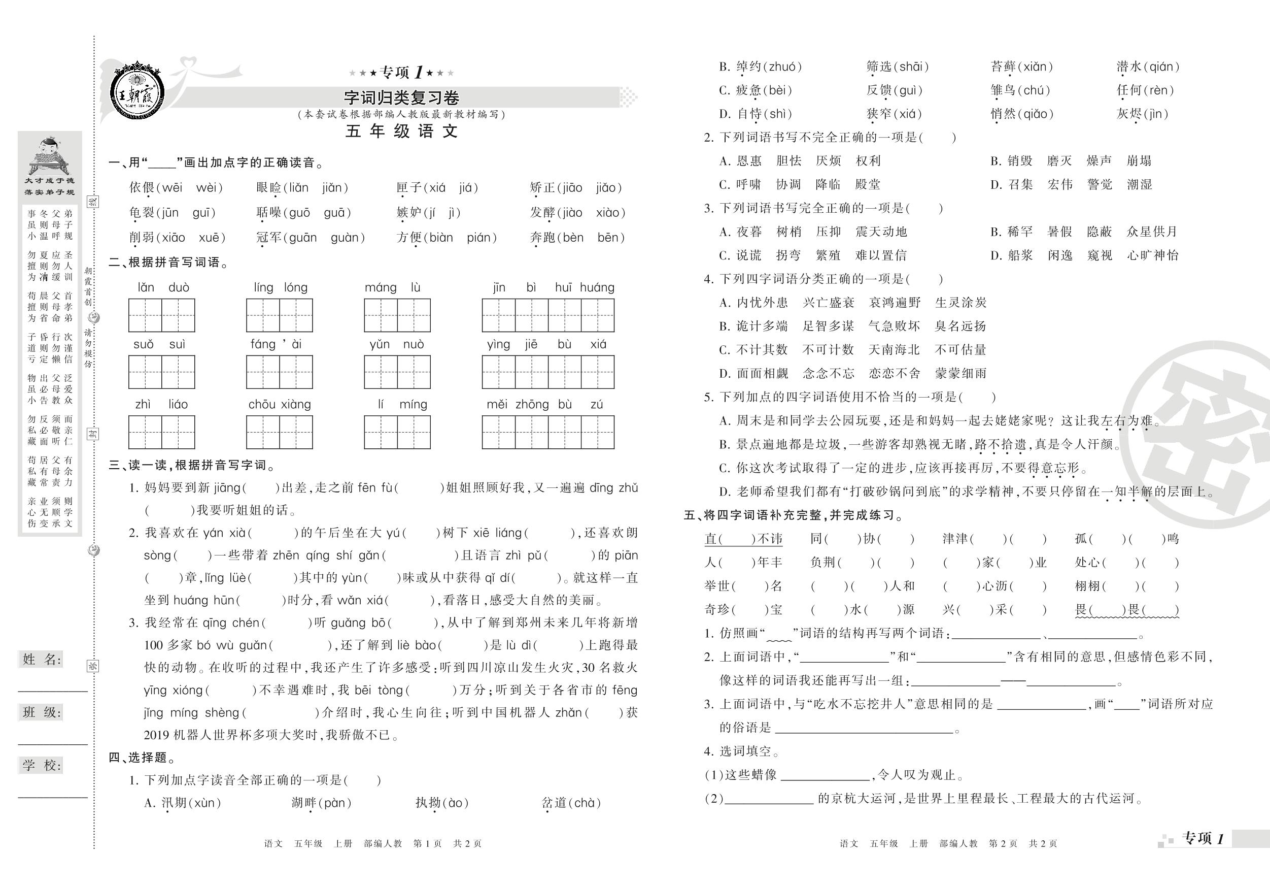 王朝霞期末专项卷——字词、句子与口语交际真题归类复习卷五年级上册语文(人教版)_R210801194432【0】