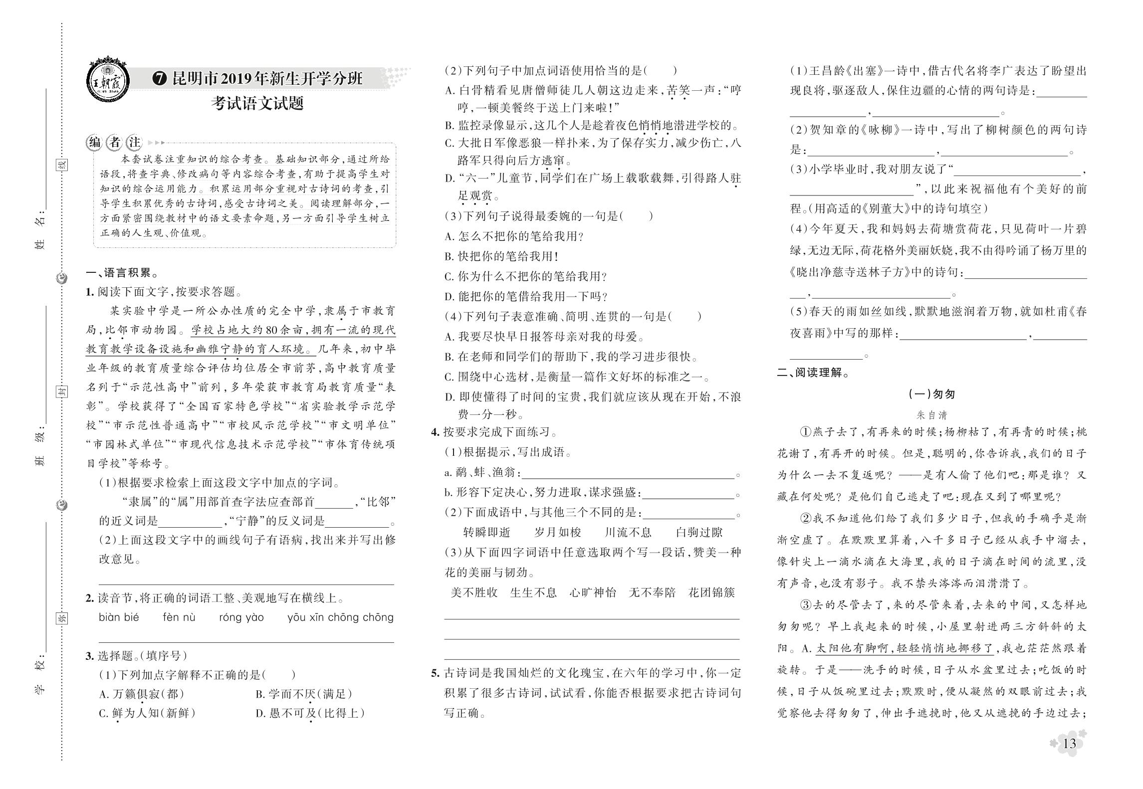 小升初语文昆明市2019年新生开学分班考试语文试题【7】
