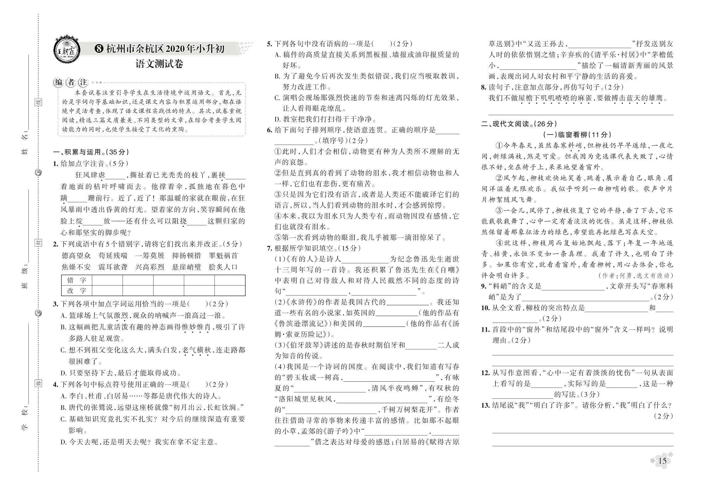 小升初语文杭州市余杭区2020年小升初语文测试卷【8】