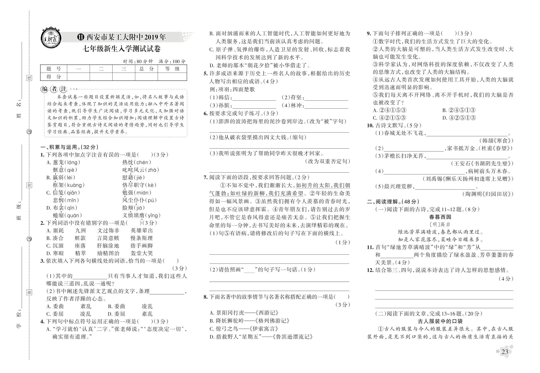 小升初语文西安市某工大附中2019年七年级新生入学测试试卷【11】
